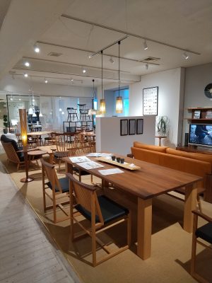 日本の家具、北欧家具、一枚板のテーブル等、洗練されたものばかりが展示されていて、店内に入るとウキウキしてしまいます。雑貨部門では日本のオシャレな伝統工芸品も扱われていて、私は以前「おりん」を購入しました。仏具が売れなくなってきて、富山県高岡市のメーカーさんが現代の生活に合わせた商品を開発しているそうです。私は玄関ドアに付ける「おりん」にひとめ惚れ。おりんの音が魔除けになるとか・・・素敵な音色を毎日楽しんでいます。
