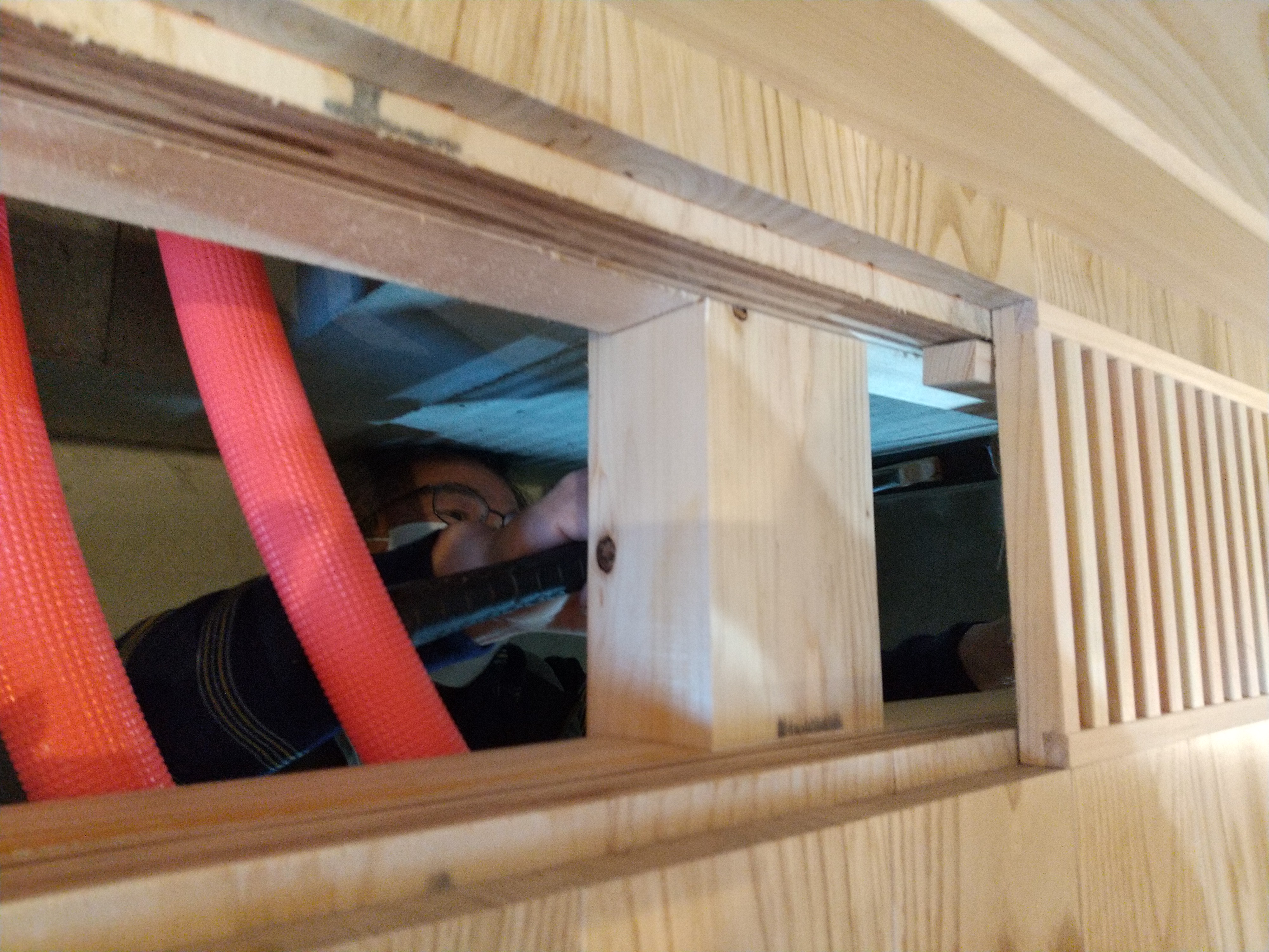 押しても引っ張っても何しても、嵌まり込んでしまって取れないガラリ。k棟梁が床下点検口から潜って、下からたたき上げます。