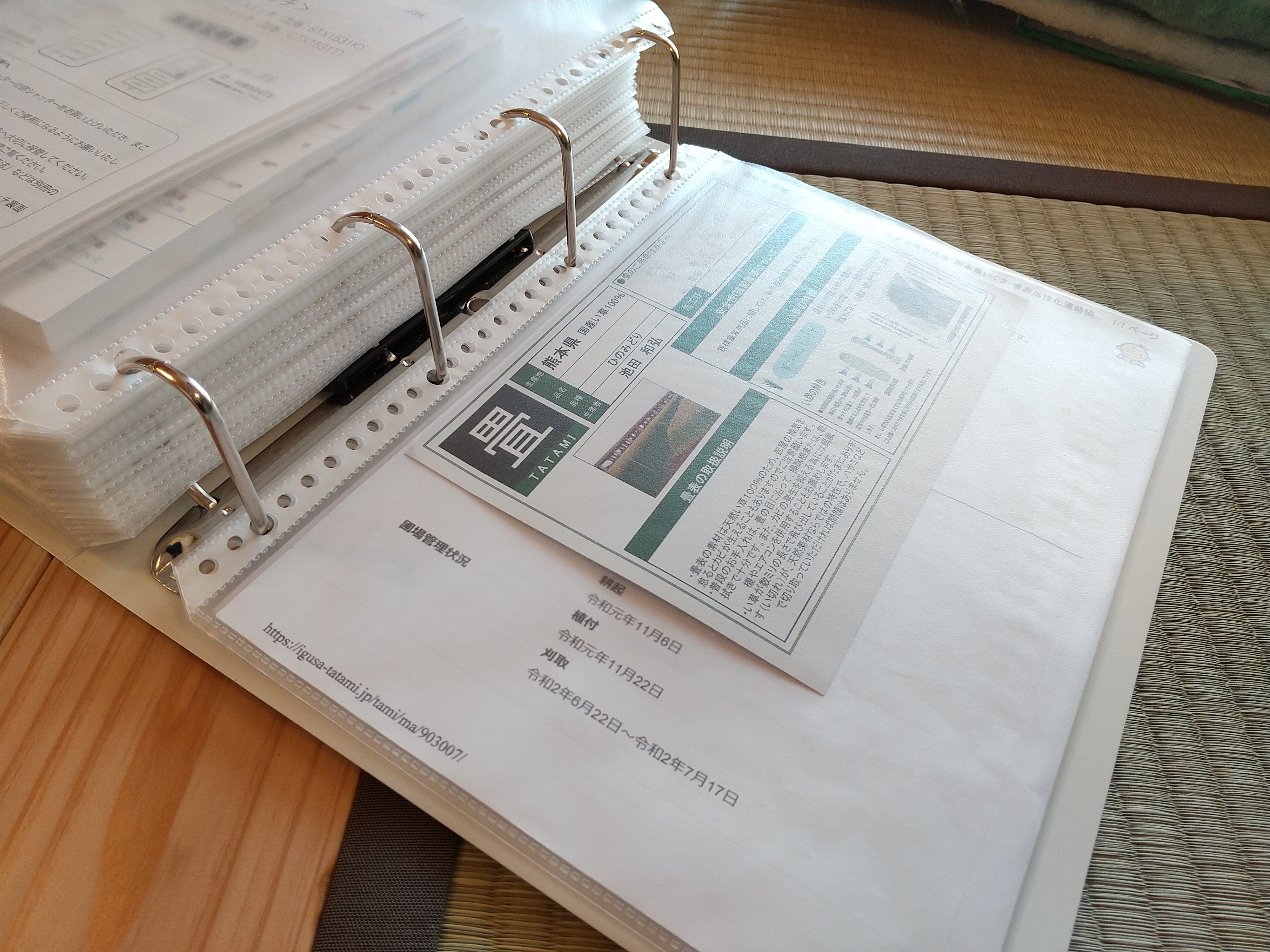 最後のに納品されます畳について、ご紹介する機会がありませんでしたので、ご紹介します。今回は熊本県産の畳表を使用しており、タタミに挟まれたQRコードで生産者情報や商品説明などが見れるようになっています。