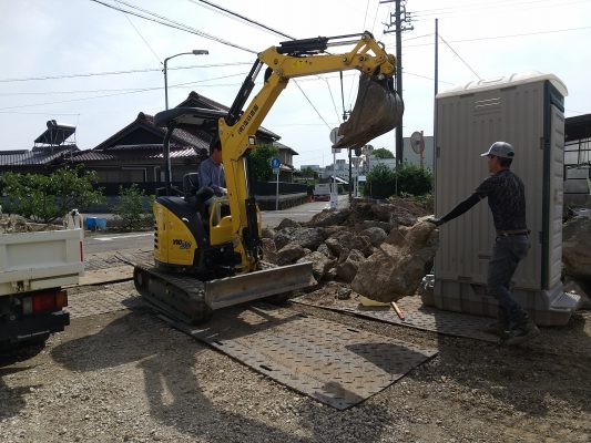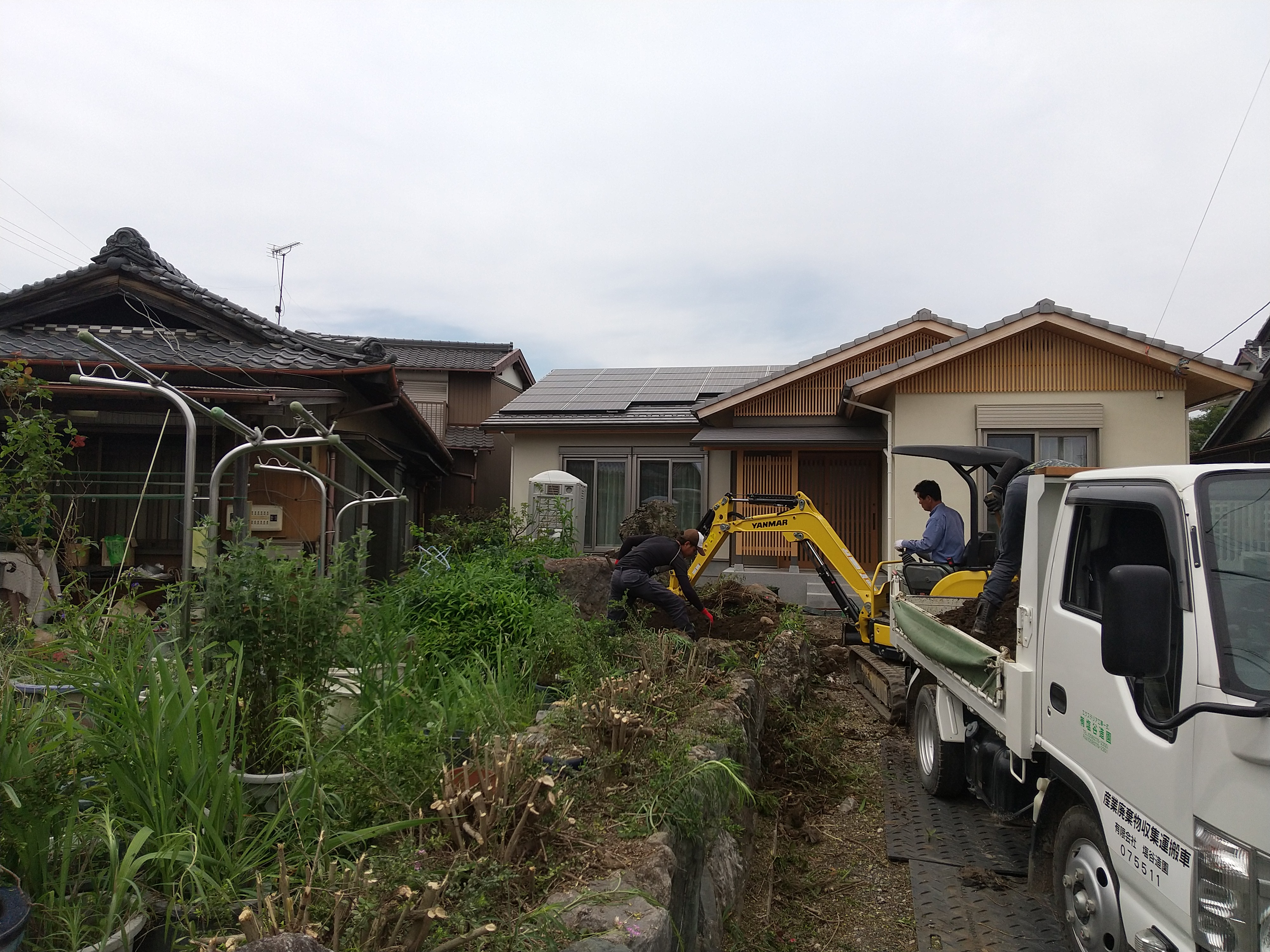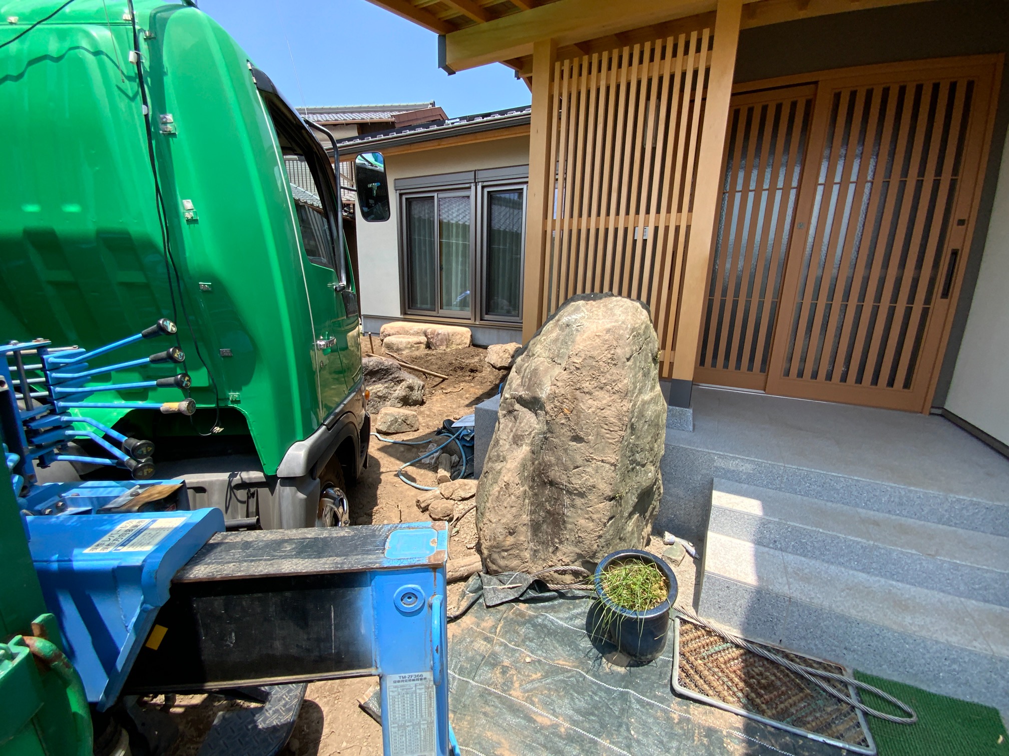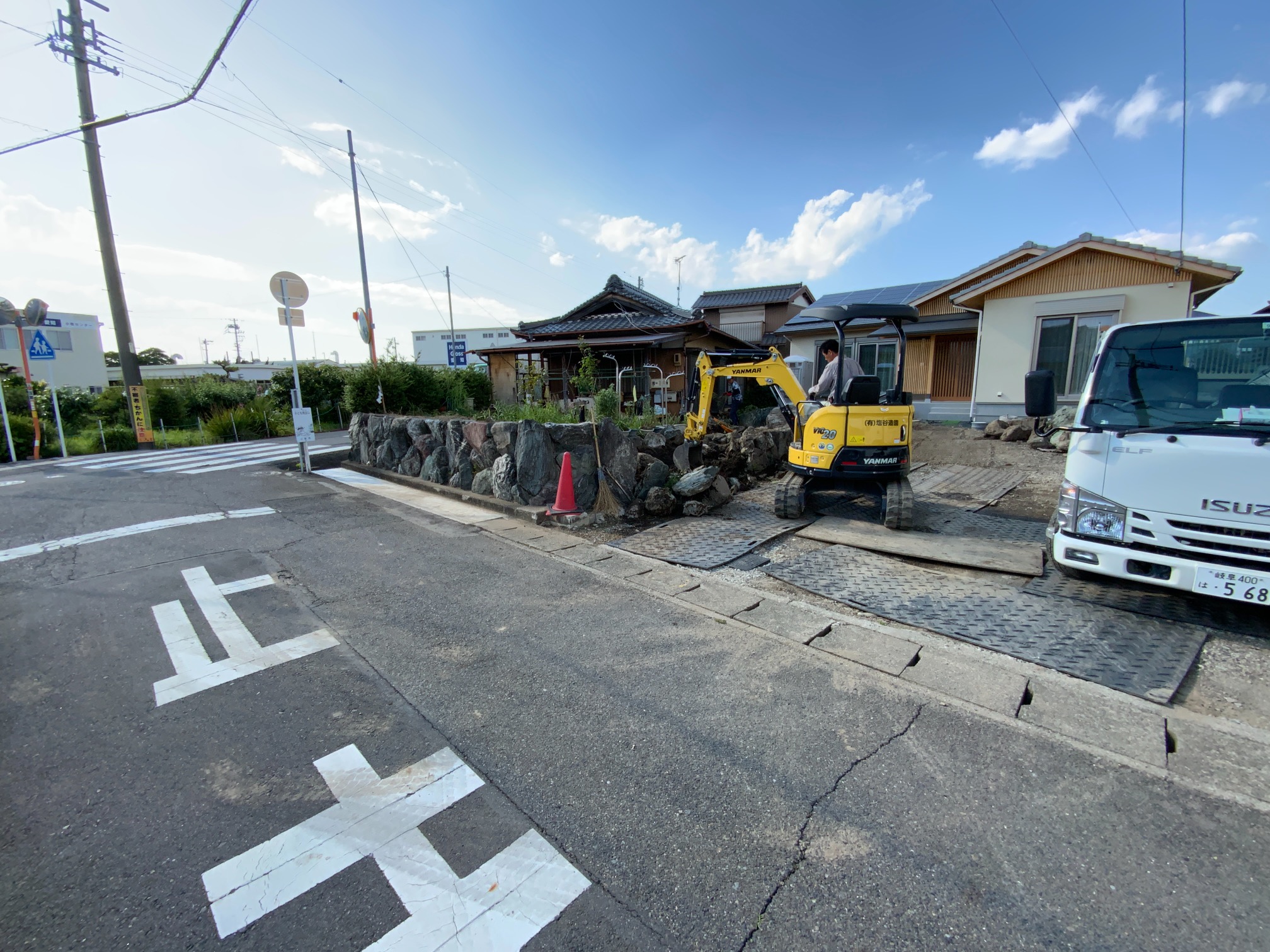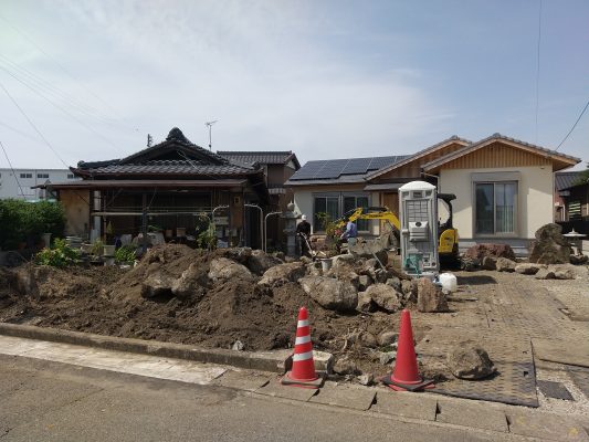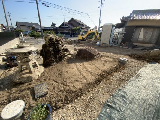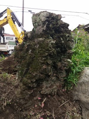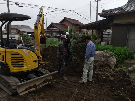 今回は、解体しながら重機で庭石を配置していきます。車庫を建ててしまうと、中まで大きな重機で入る事が出来ないので、先に重たい石だけ設置しておく段取りです。
