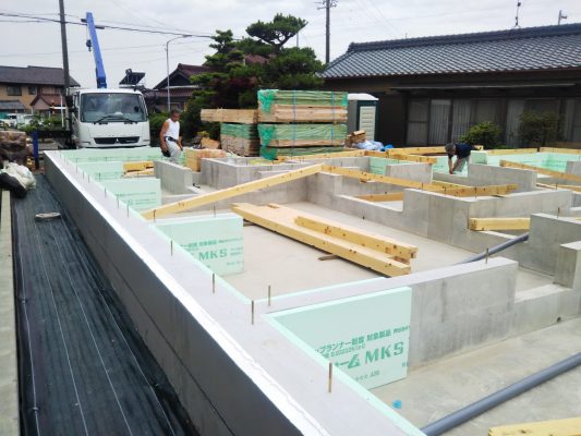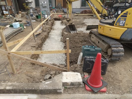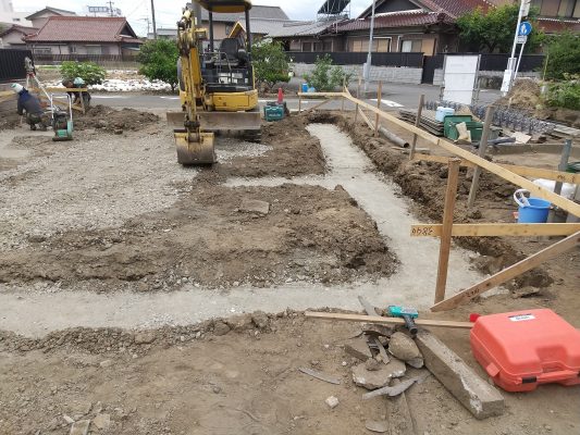 今回は基礎断熱の施工をしないため、布基礎です。掘方をし砕石を入れ、転圧をかけて締め固めています。