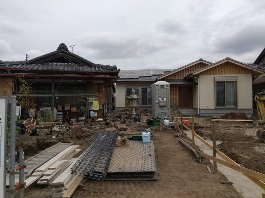 よく考えたら、また母屋は車庫によって隠れてしまいます。仮設トイレが邪魔ですが、母屋とハナレが見渡せるのは今しかないので、1枚記念に撮っておきます。