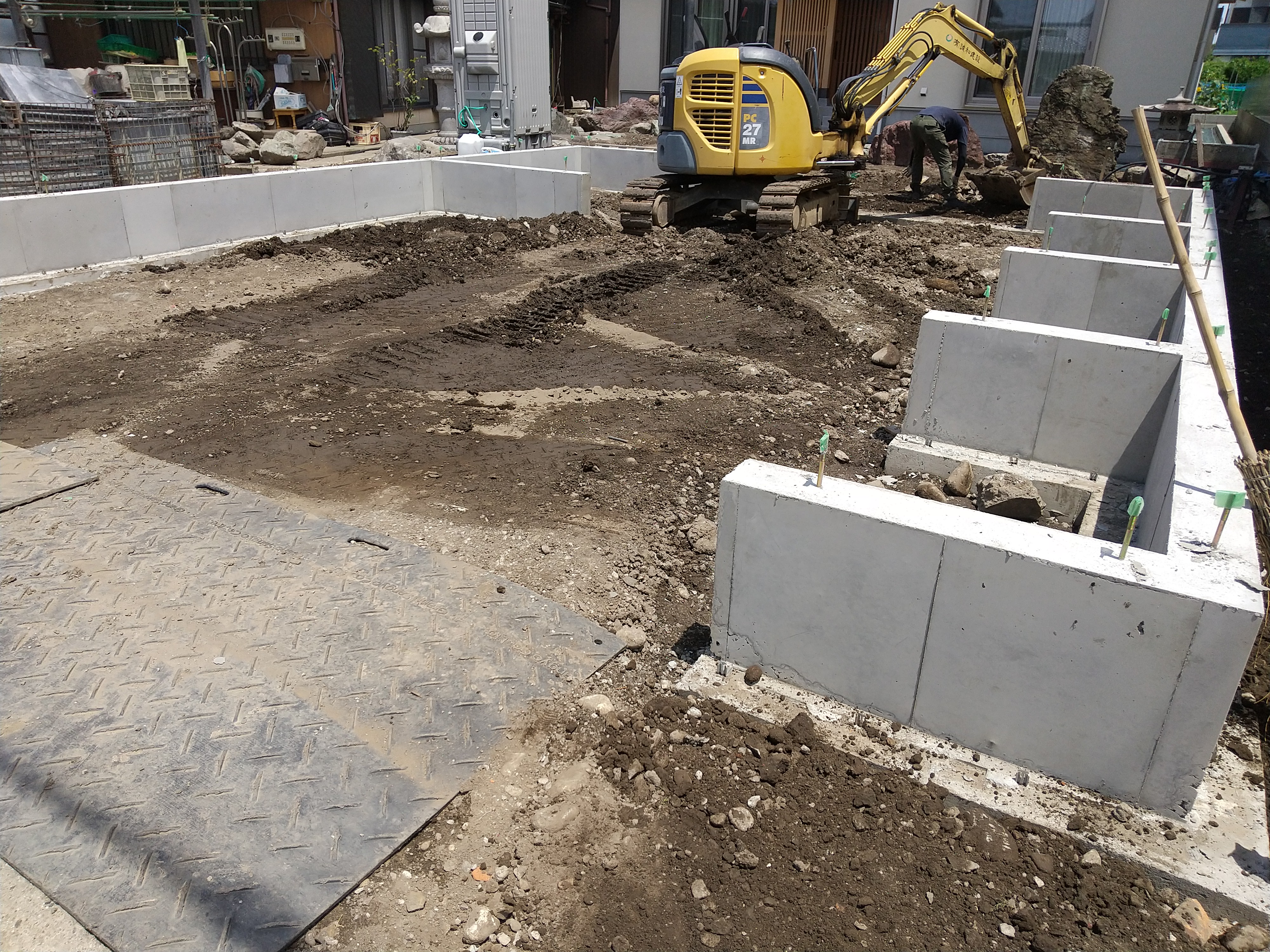 基礎は立上りも完成し、内部の土間コンクリートを打つために土を出す作業をしています。