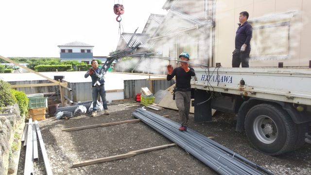配筋をしていきます。軽そうに見える鉄筋も束ねるとかなりの重量になります。「危ないので~」と珍しく女性扱いしていただき、少し離れて見物です。