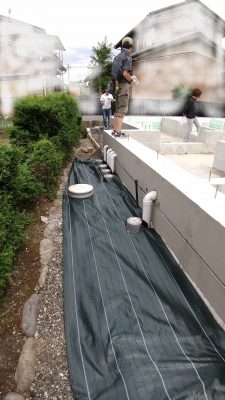 基礎工事の傍ら、a監督が建物周りに防草シートを敷いていました。建築は長丁場ですので草が生えるのを防ぐのと、こちらが敷いてあることにより、落ちた釘なども発見しやすく外部の仕事をする職人さんの足元が汚れませんので、a監督の気遣いを感じます。