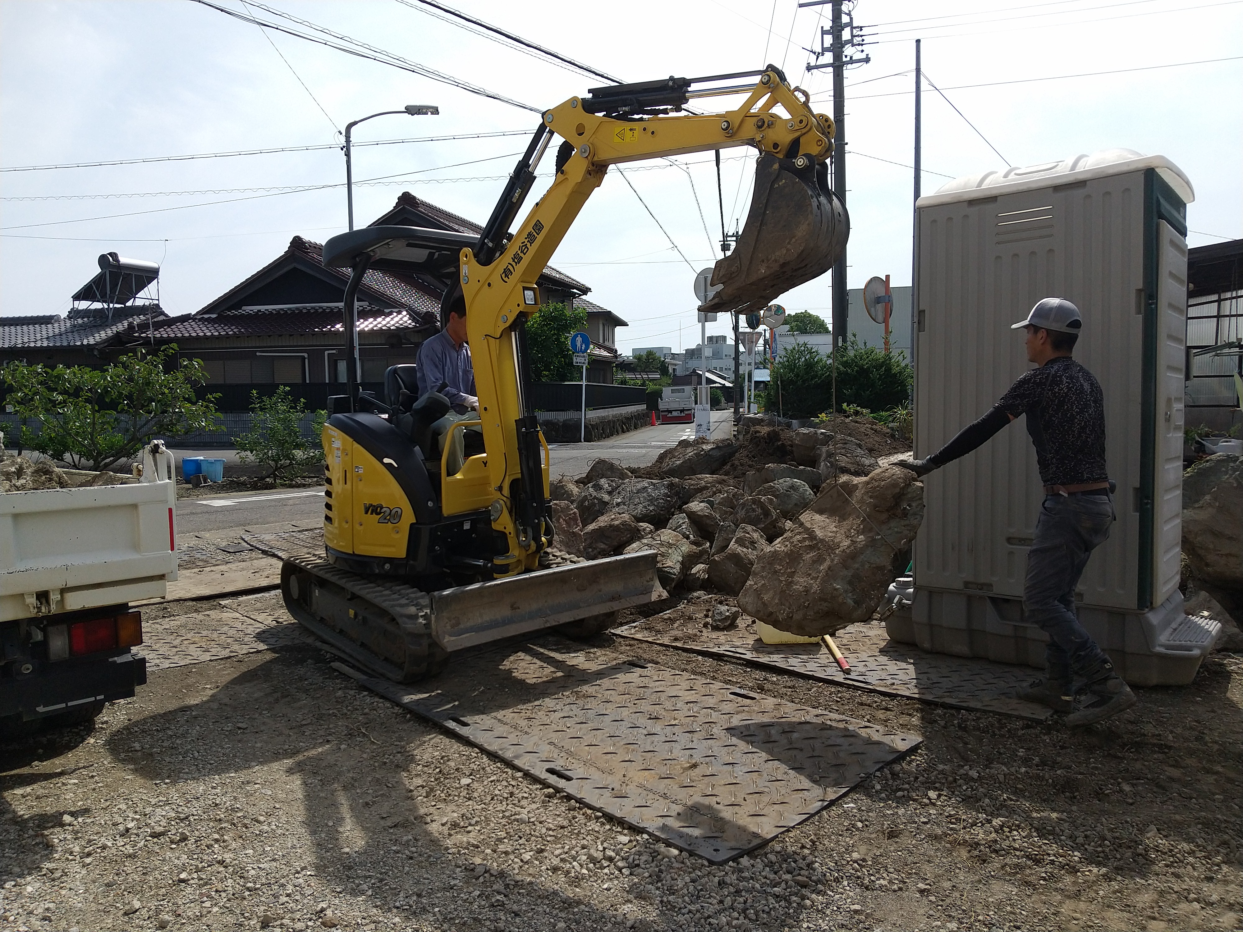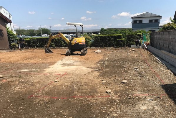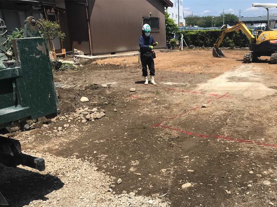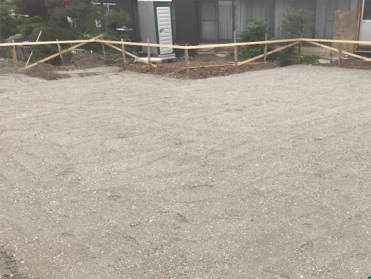 地均し後、砕石を敷き、転圧をかけ締め固めていきます。今回は、設計GLを既設地盤よりも高くし盛り土を30cm行うため、ほとんど残土の処理も必要ないので、i様に追加費用をお伝えしなくて良いので気持ちが楽です~