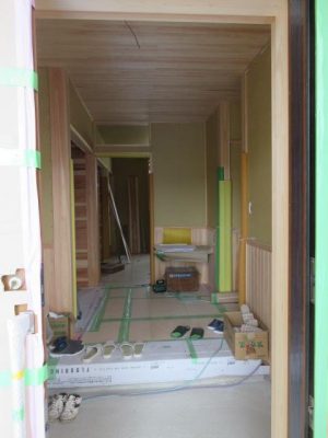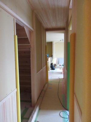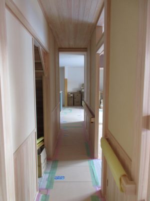 内部珪藻土の仕上げ塗りが施されました。和室はじゅらく壁調で落ち着いた色合いで、玄関・廊下は明るい色目です。