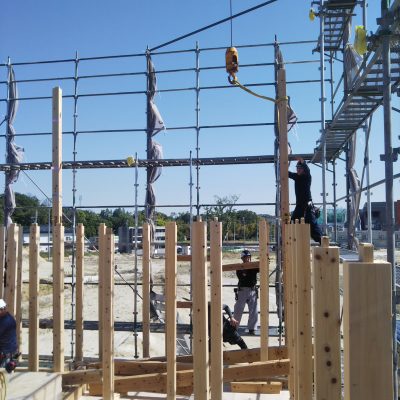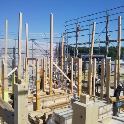 この後、木摺(ラス下地)→防水紙→ラス網→モルタル→仕上げと進んでいきます。