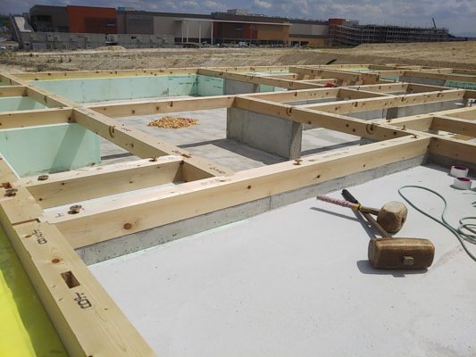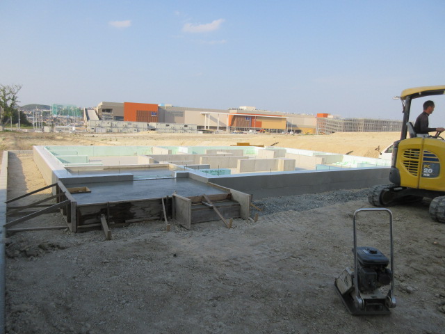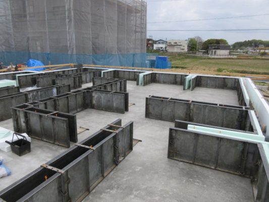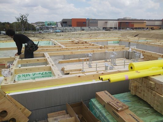 基礎の型枠が組まれています。既に外壁側の内・外側に断熱材を施してあるので、後日生コンを流し込んでいきます。
