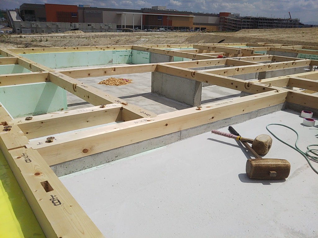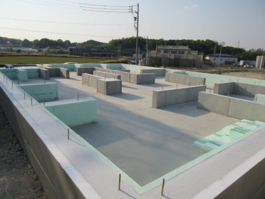 基礎の型枠が撤去されました。断熱材の厚みは内周部は50㎜、外周部には70㎜施されています。