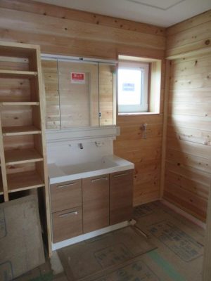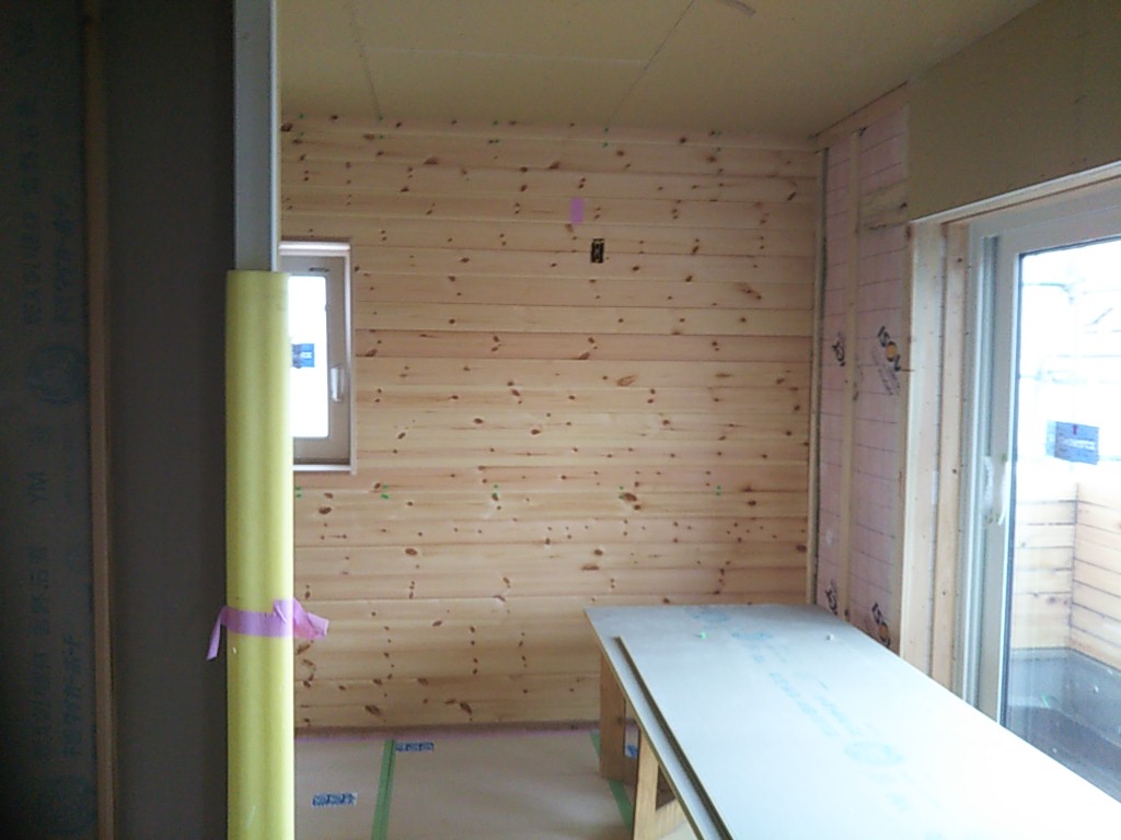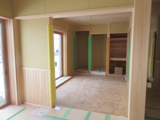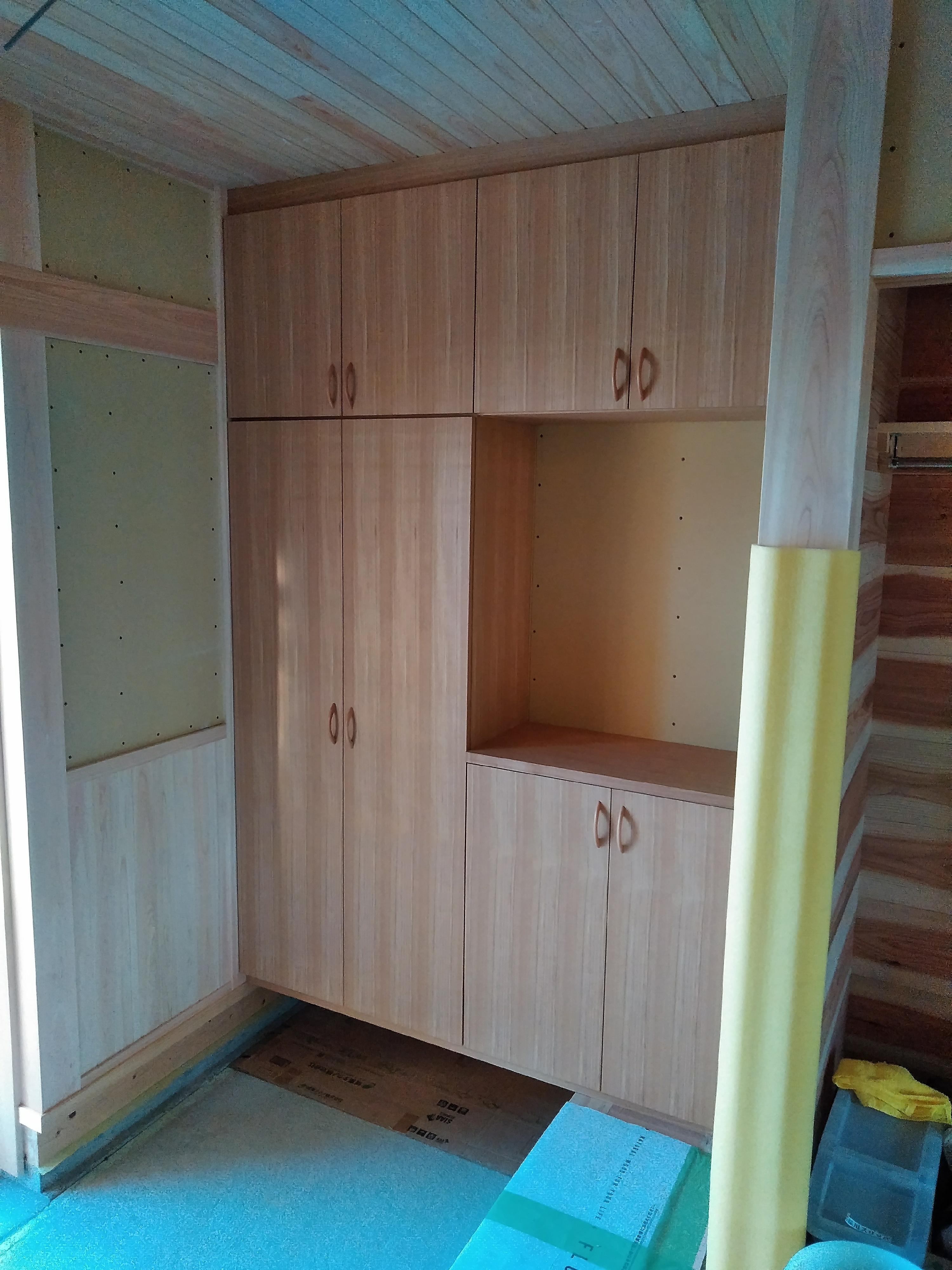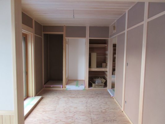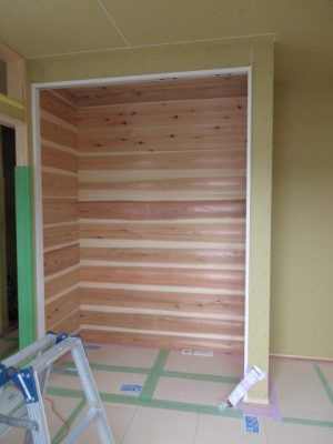 内部は天井、外壁側の真壁部分にプラスターボードが張られました。収納は建具枠が取り付けられました。壁は杉材です。