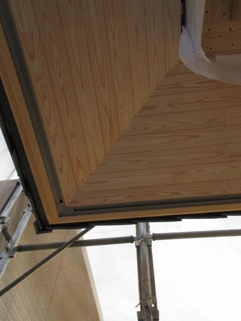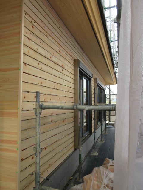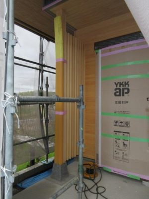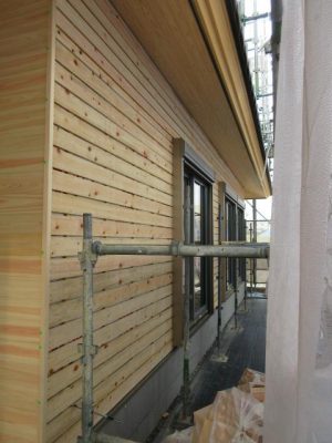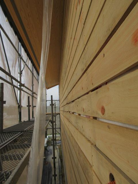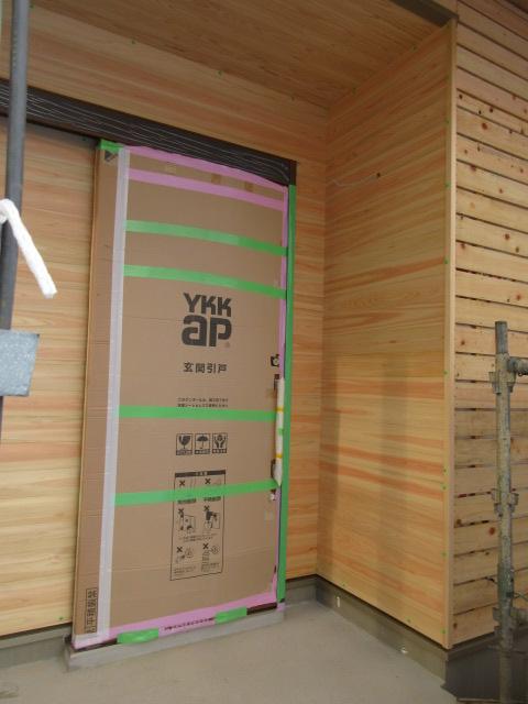 外部は玄関の桧羽目板が張られました。内側に入っている場所なので汚れも付きくく、経年の変化が楽しめそうです。