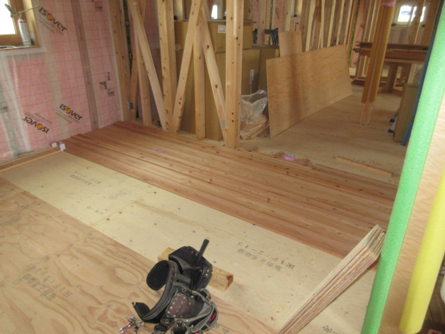 1階は主に強度があり色合いの優しいメープル材、2階は足触りの良い杉材を使用します。