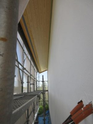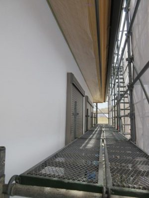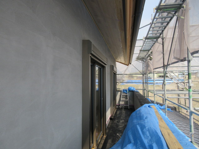 外壁に漆喰が施されました。ちょっとわかりづらいですが、左官屋さんがコテで塗り付ける「ラフ仕上げ」です。