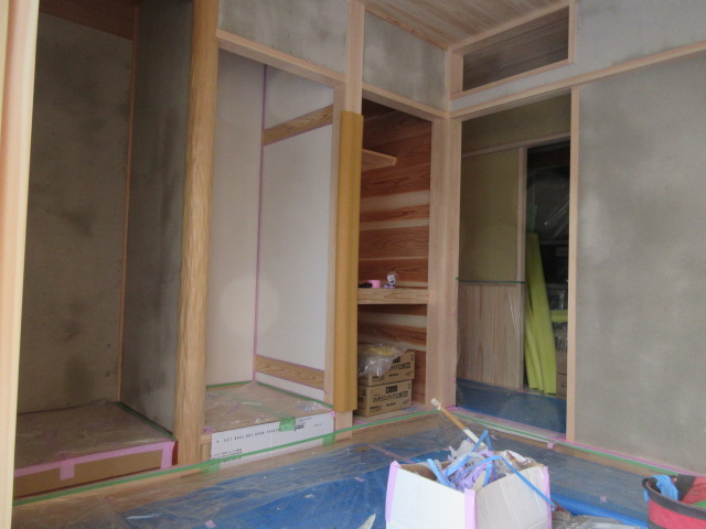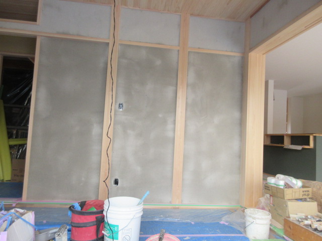 和室は珪藻土の塗り壁仕上げです。その前に、ひび割れ防止と強度に優れた下地を塗ります。