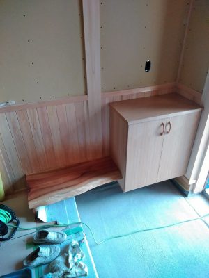 製作の玄関収納が設置されました。杉板のベンチも取り付けられ、靴の脱ぎ履きがスムーズにおこなえます。