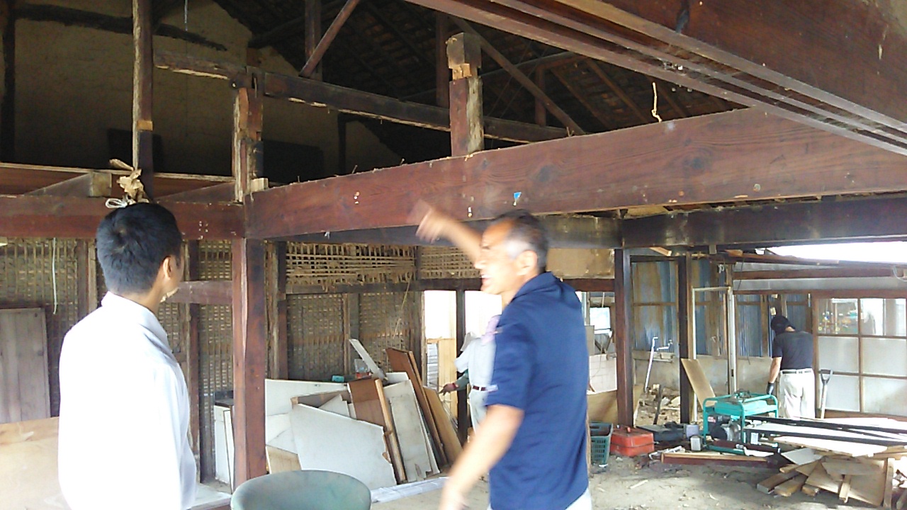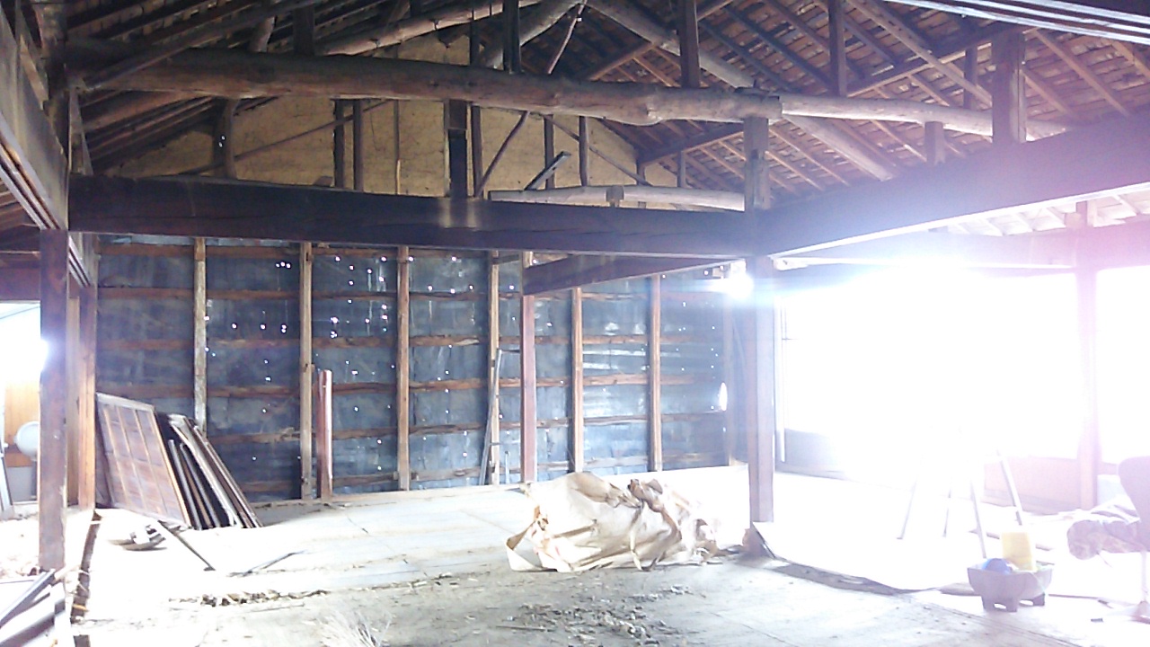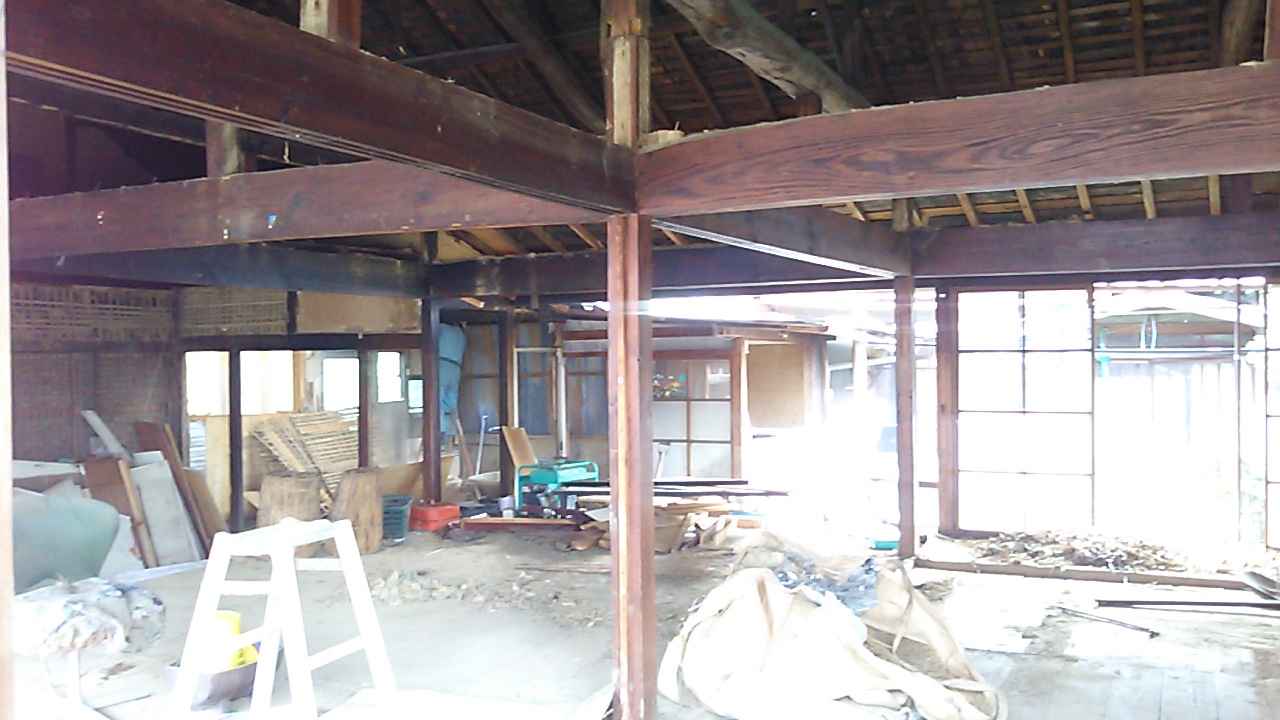 解体中の内部。柱と差鴨居で構造が持っているようなものです。耐力壁がなく非常に不安定に感じます。