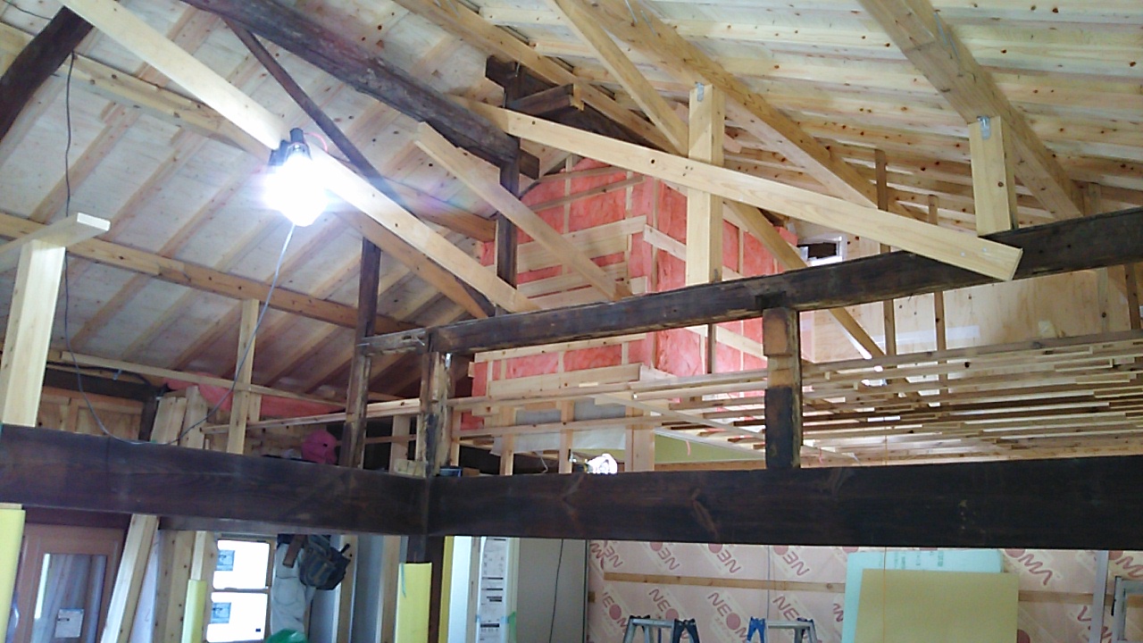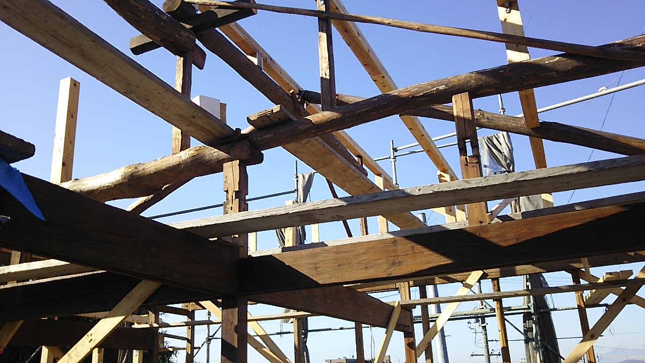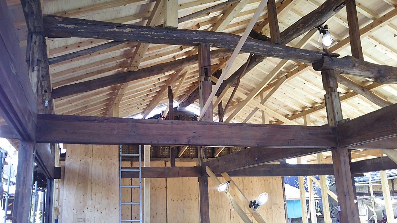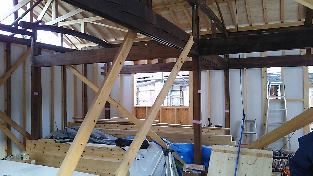 小屋組の工事が進んでいます。古材の補強をしつつ屋根下地を組んでいきます。
