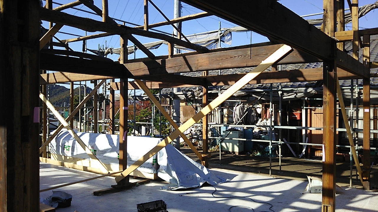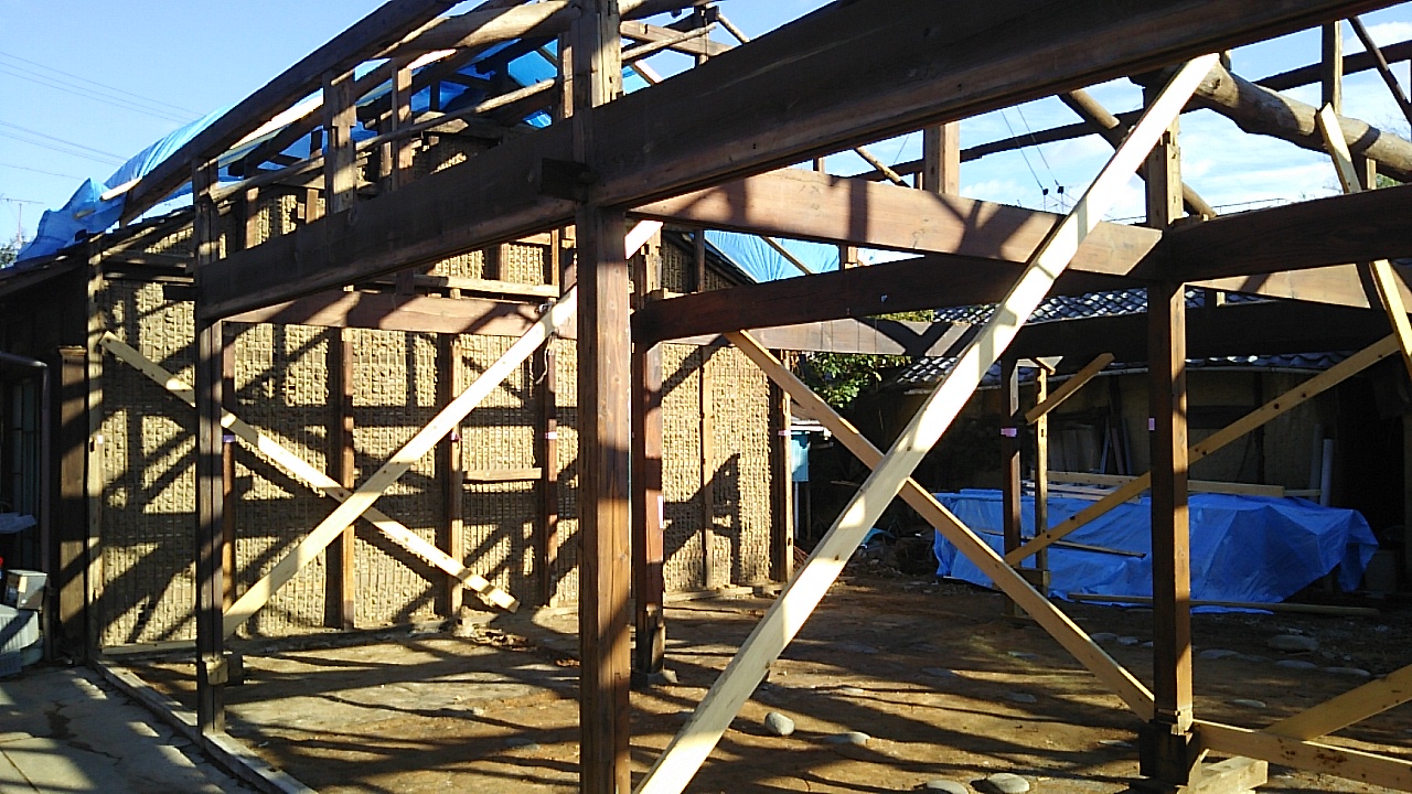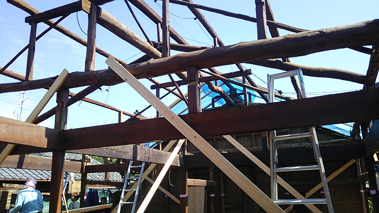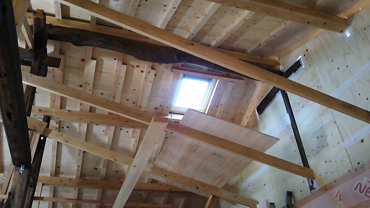 小屋組の工事が進んでいます。古材の補強をしつつ屋根下地を組んでいきます。