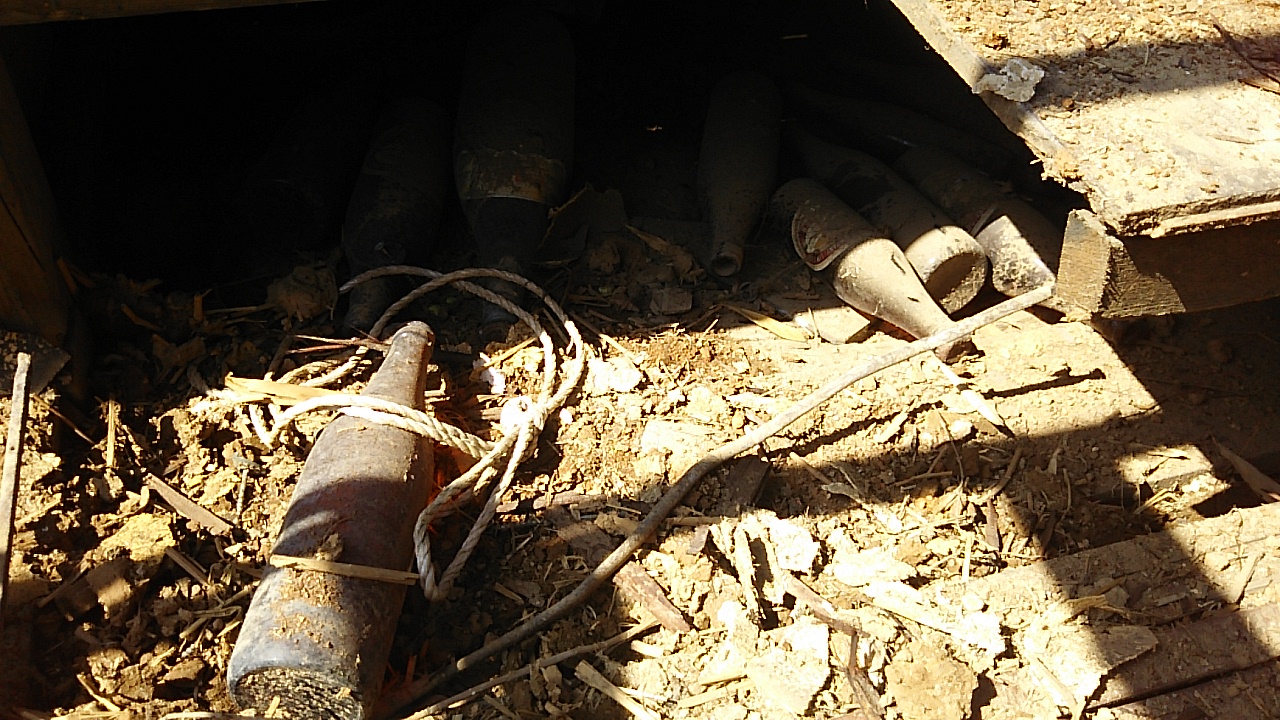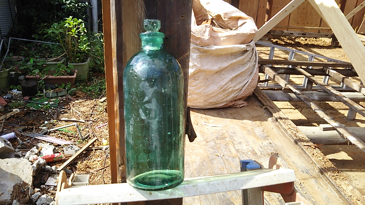 酒瓶のようなものが出てきました。まだ製造技術が未熟な年代に造られたものと見え、硝子の中に気泡が見られます。