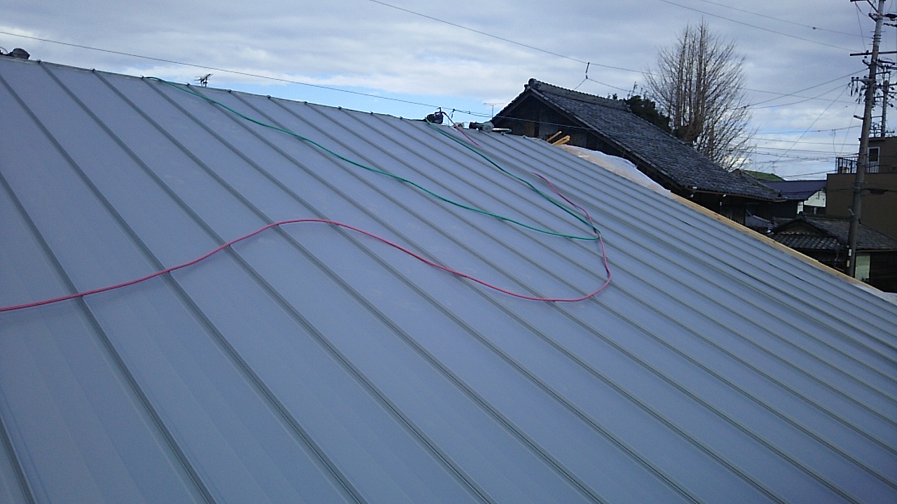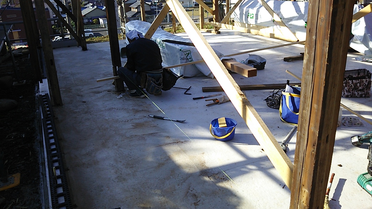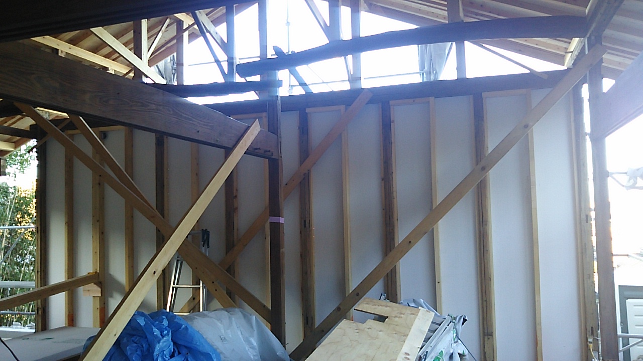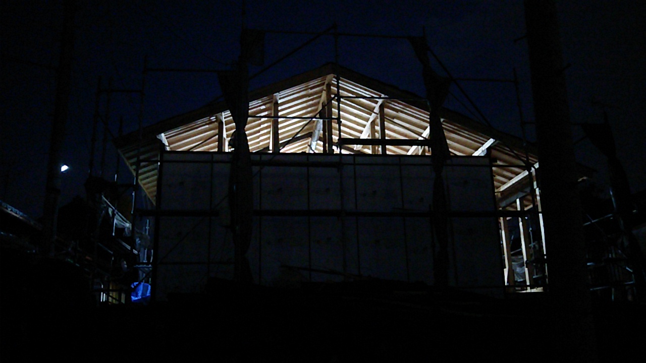 構造体の水平、垂直を直す間、がらんどうだった家に屋根下地がかかりました。