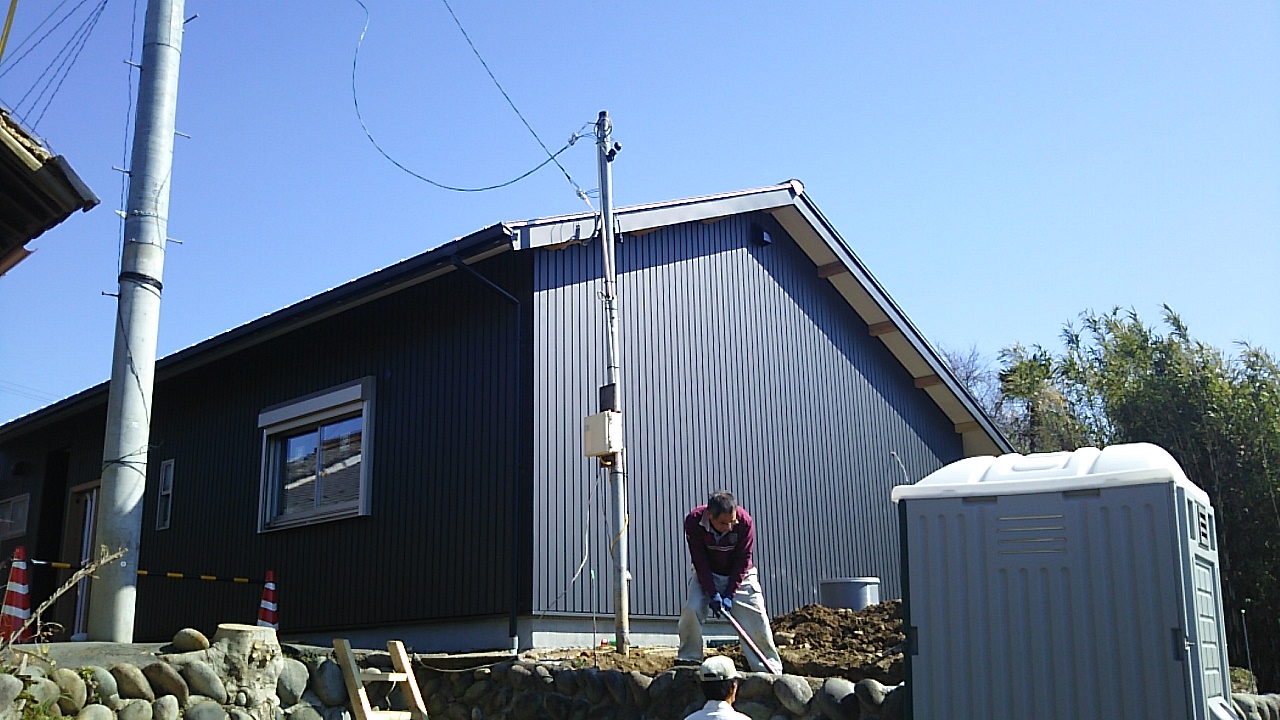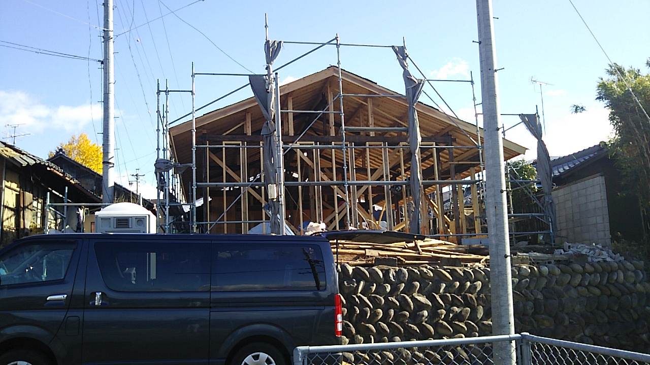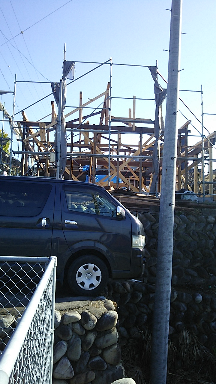 反対側から見たところ。それにしても大工さんの車両の絶妙な駐車の仕方よ。