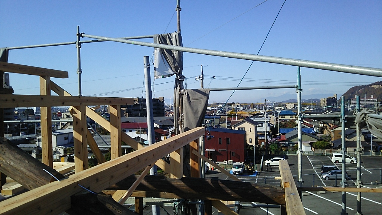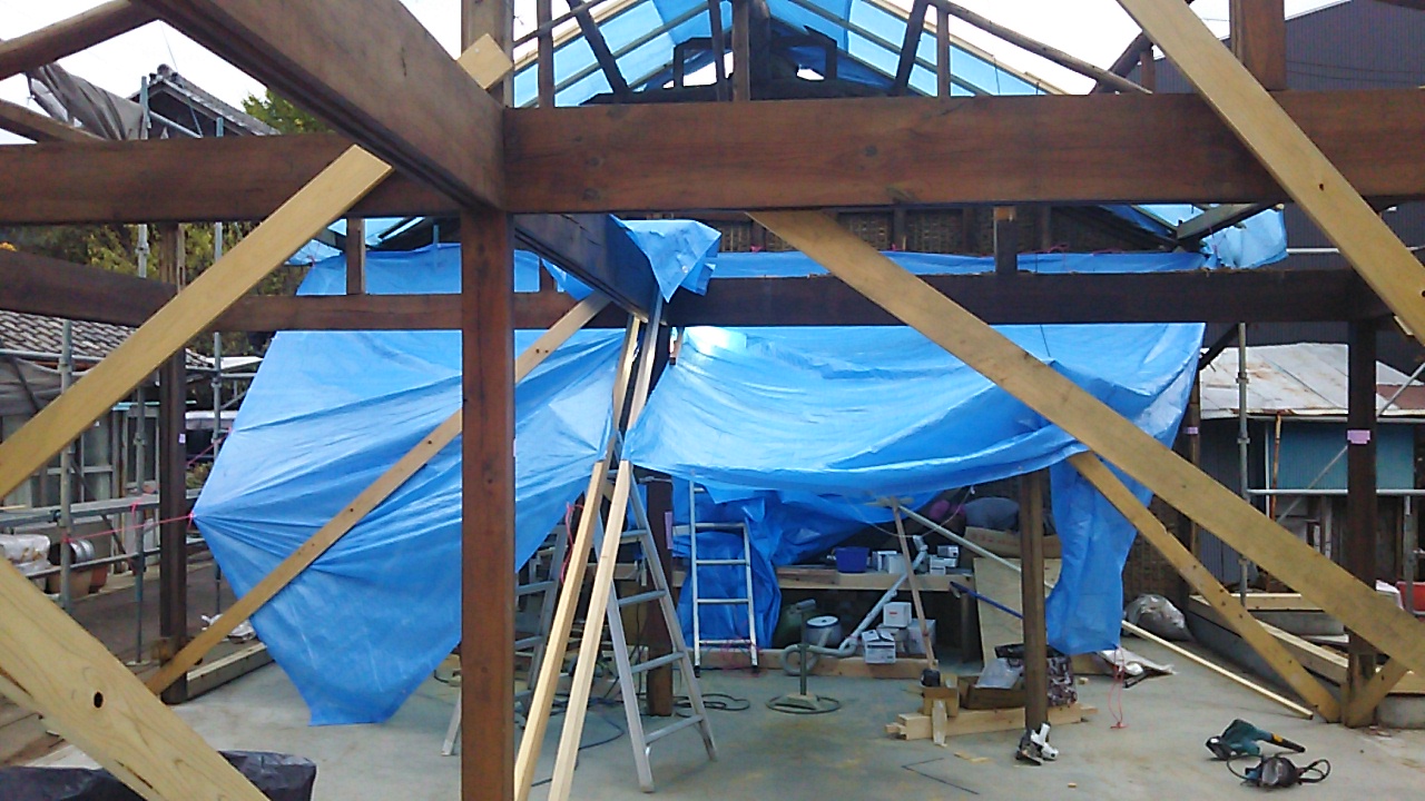 瓦、屋根土、野地、垂木が取り払われました。10月の秋晴れの空が見えて、何ともスッキリしています。