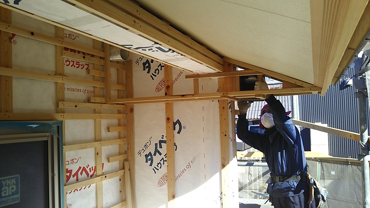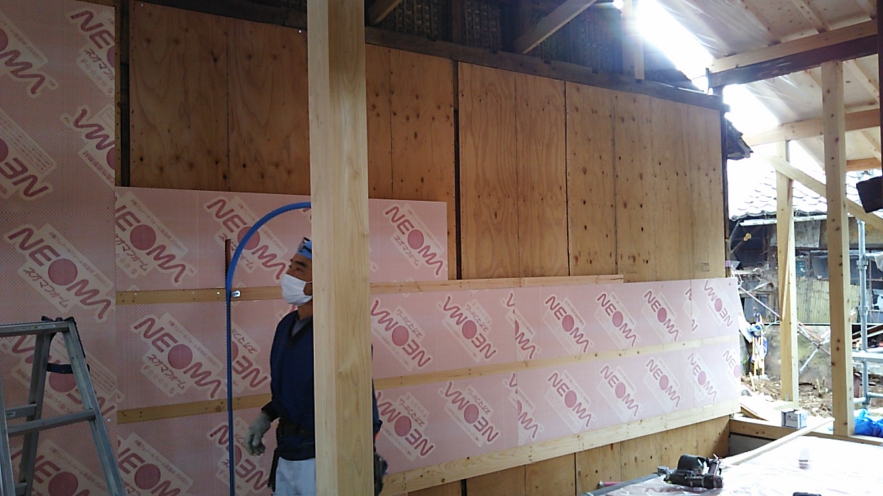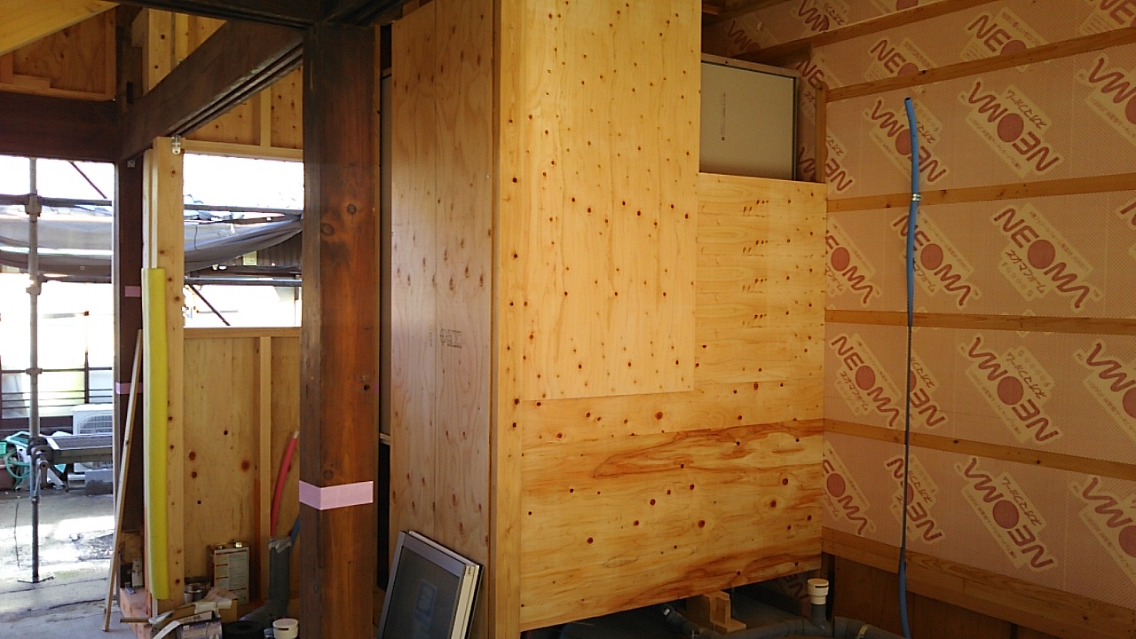 耐震改修工事につき、構造用耐力面材を張りました。