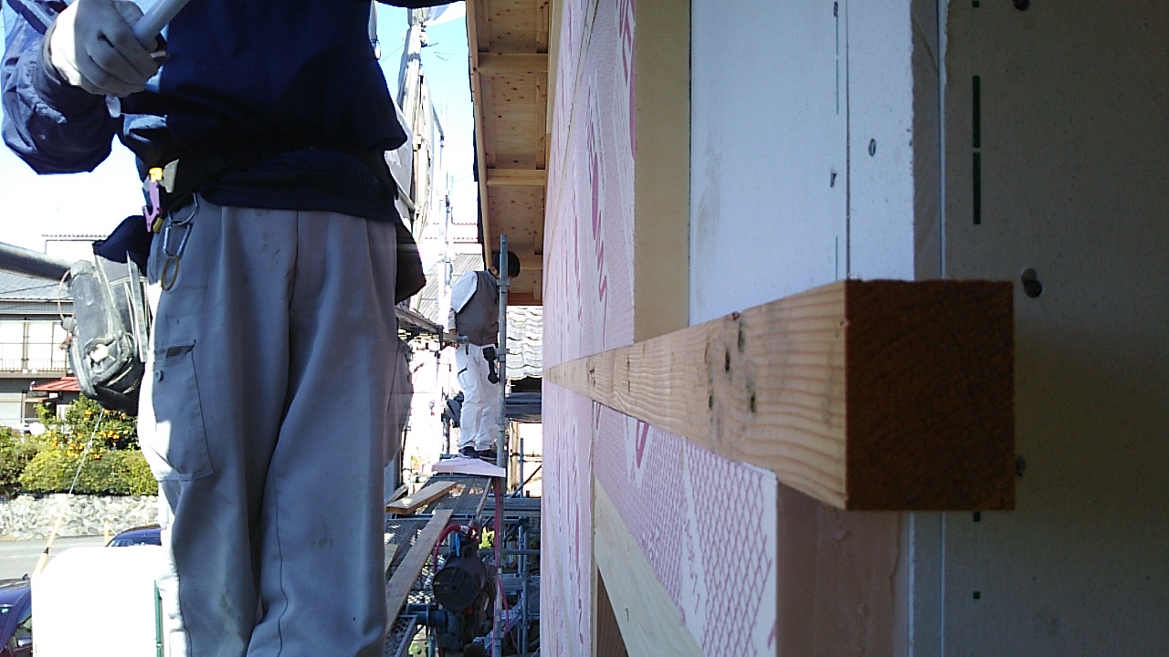 外壁の断熱工事。構造用面材の外側に下地を組んで、ボード状の断熱材を取り付けています。