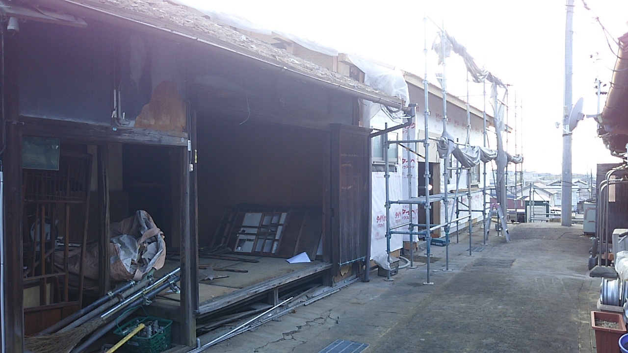 今回は長屋となっており、お隣さんが柱一本隔ててすぐ隣に建っていますので、東面は内側からの作業となります。