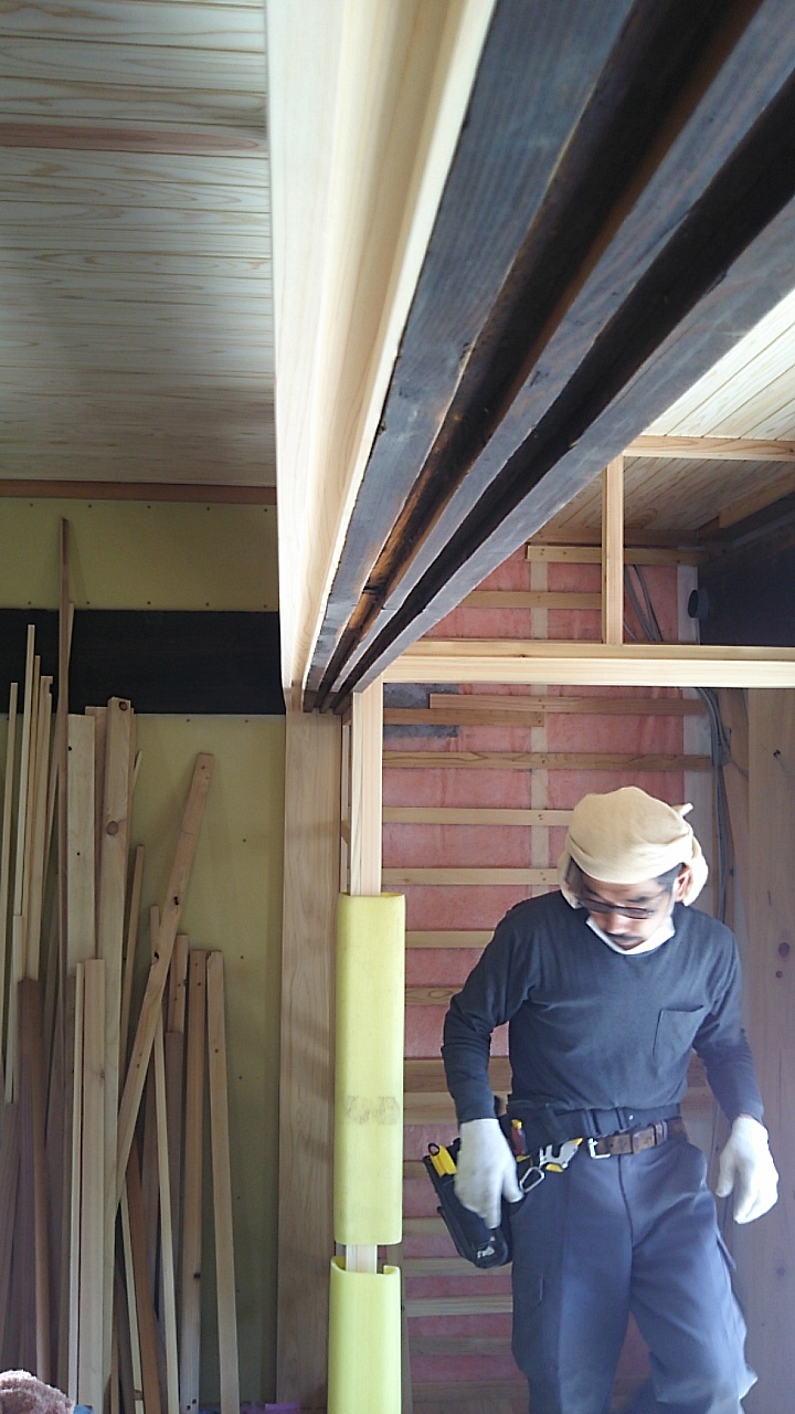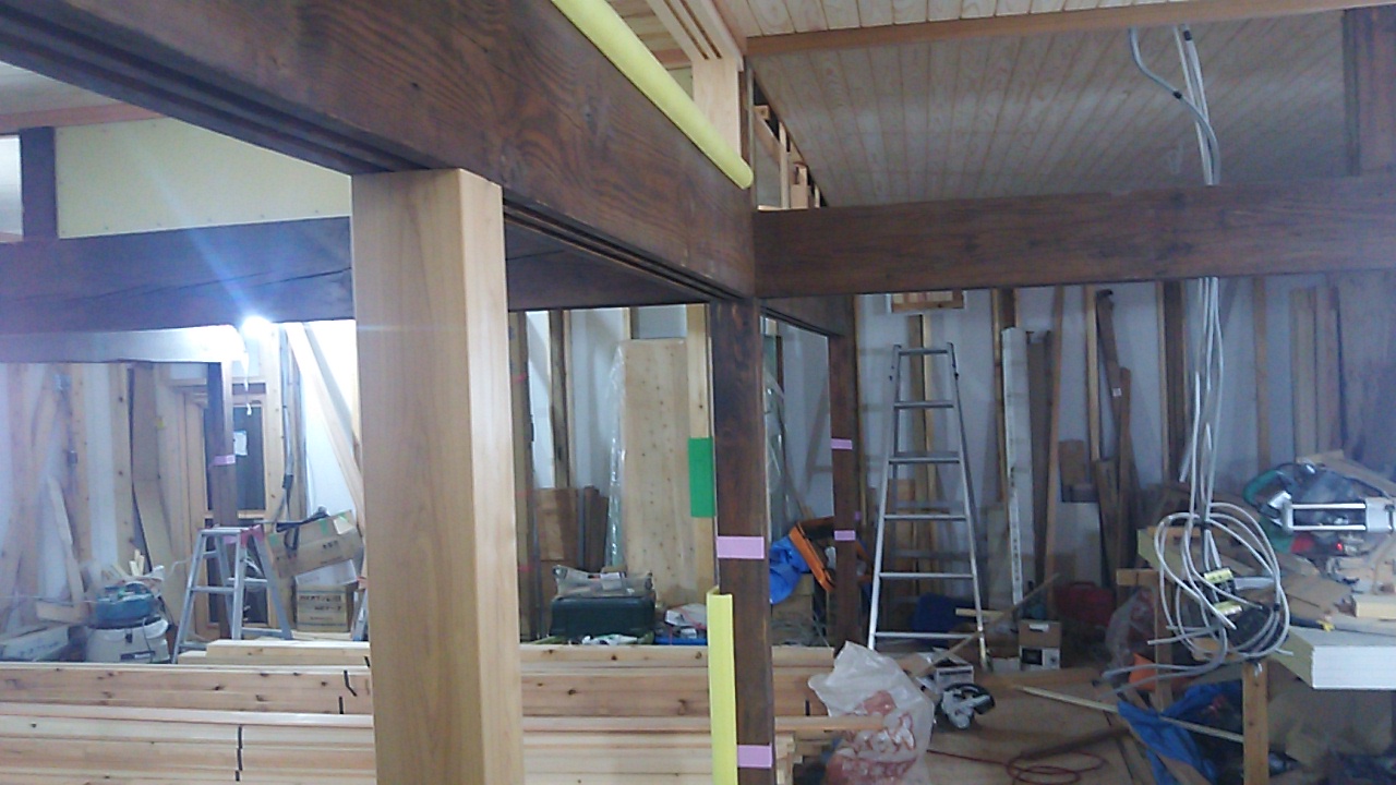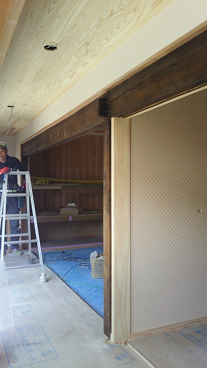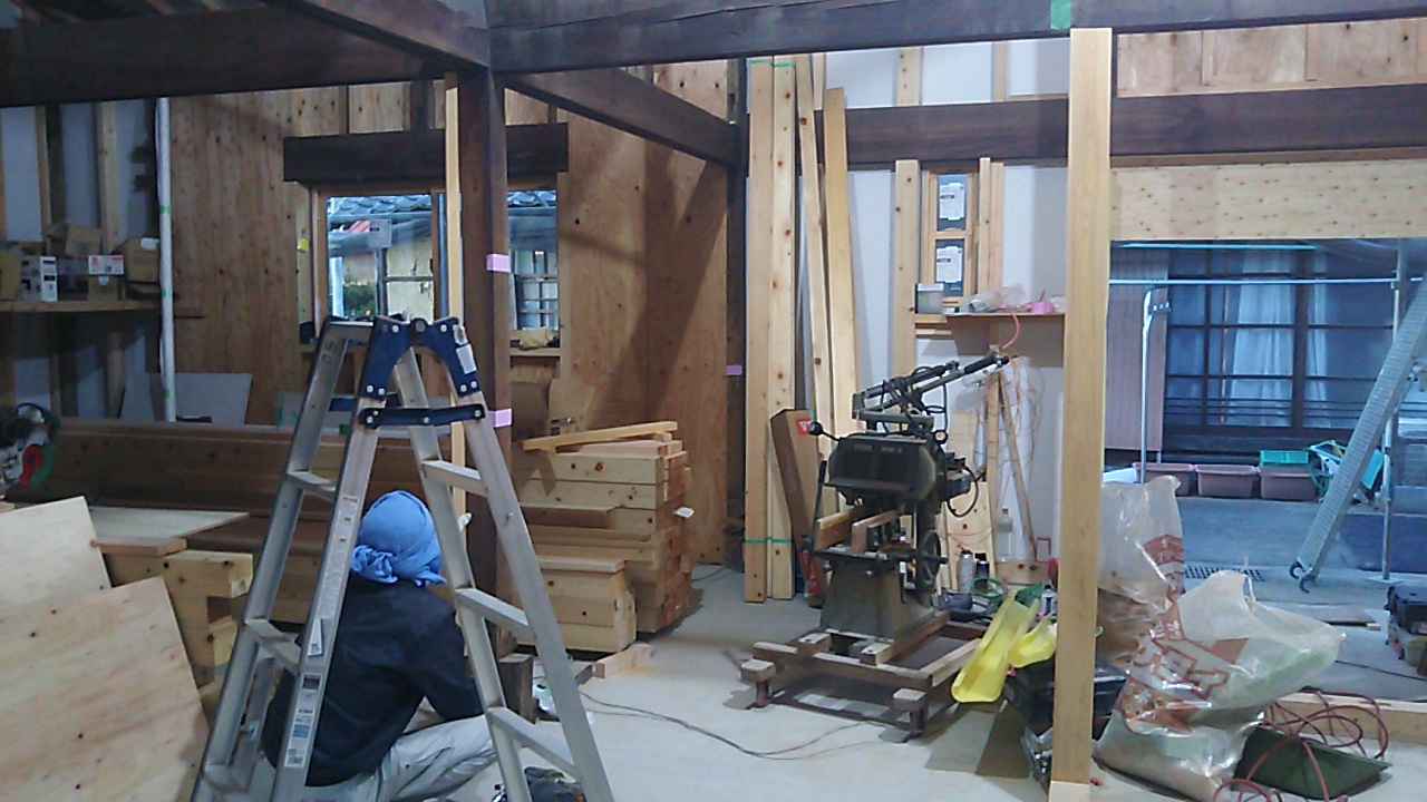 内部では造作工事が進んでいますが、古い材料は真っ直ぐになっていないので新しい材料との取合せが大変なようです。