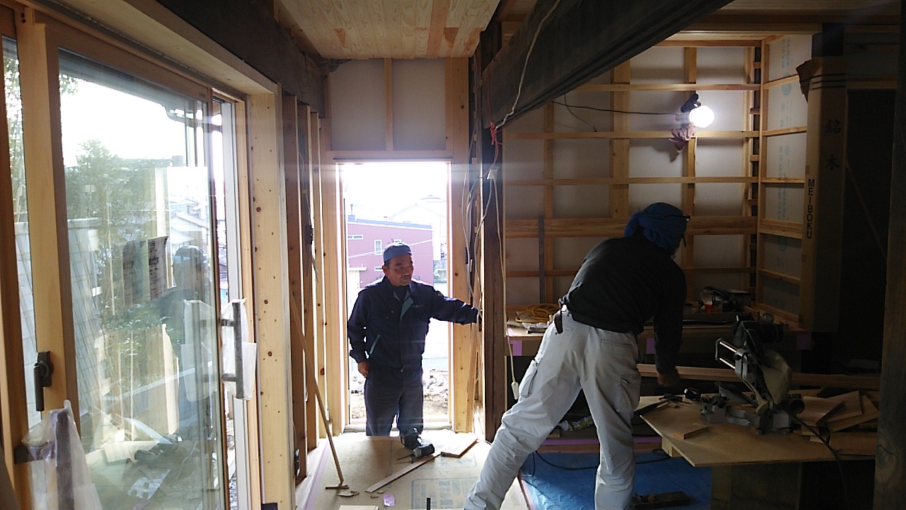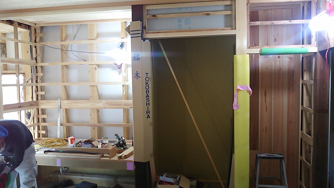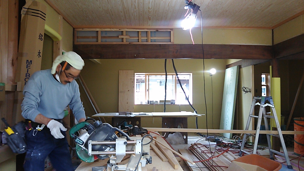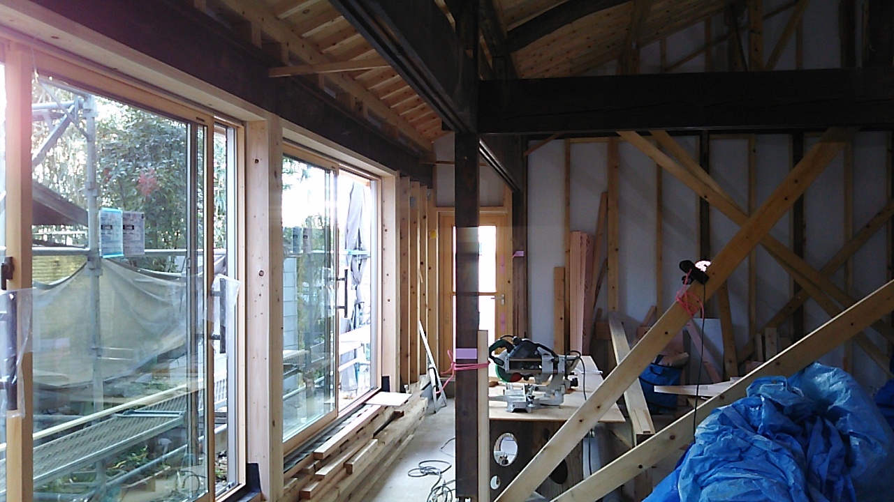 内部では造作工事が進んでいますが、古い材料は真っ直ぐになっていないので新しい材料との取合せが大変なようです。