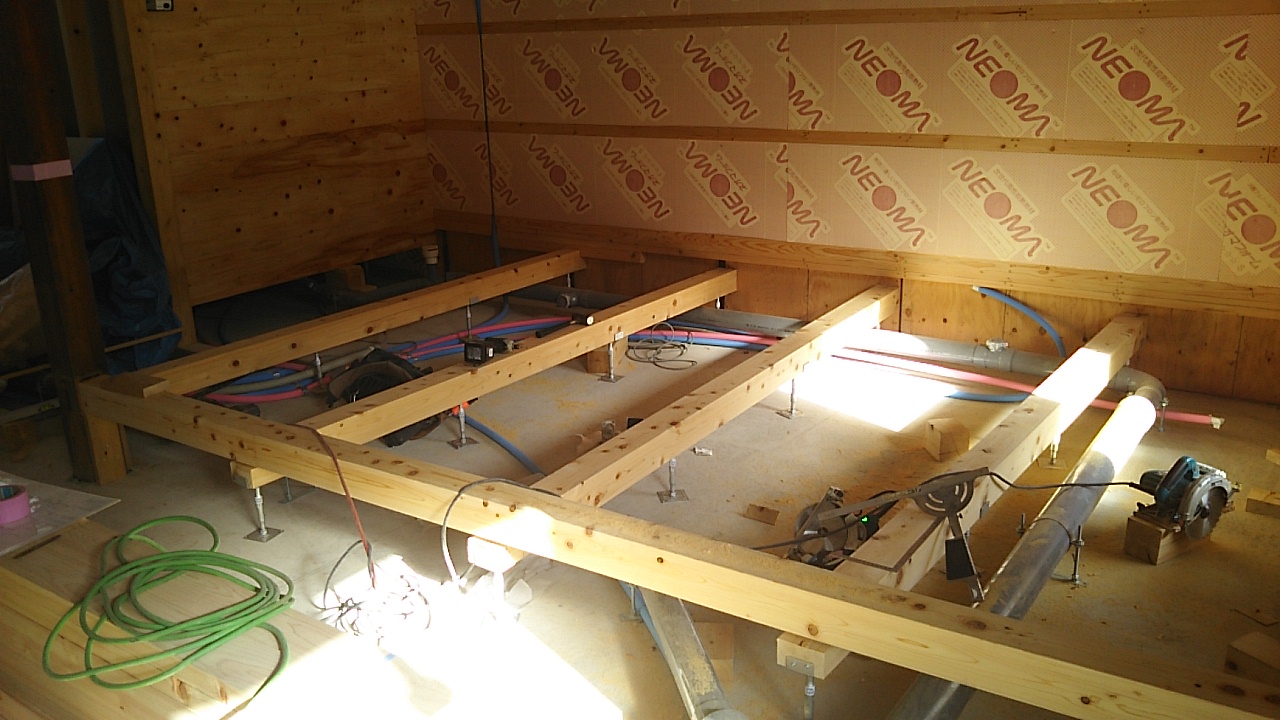 天井下地が組み始められています。天井裏の一部に断熱材が渦巻く『竜の巣』みたいな一角がありますが・・・
