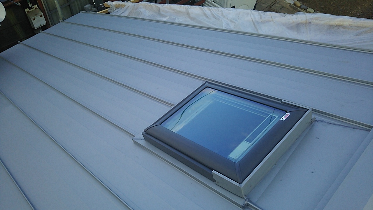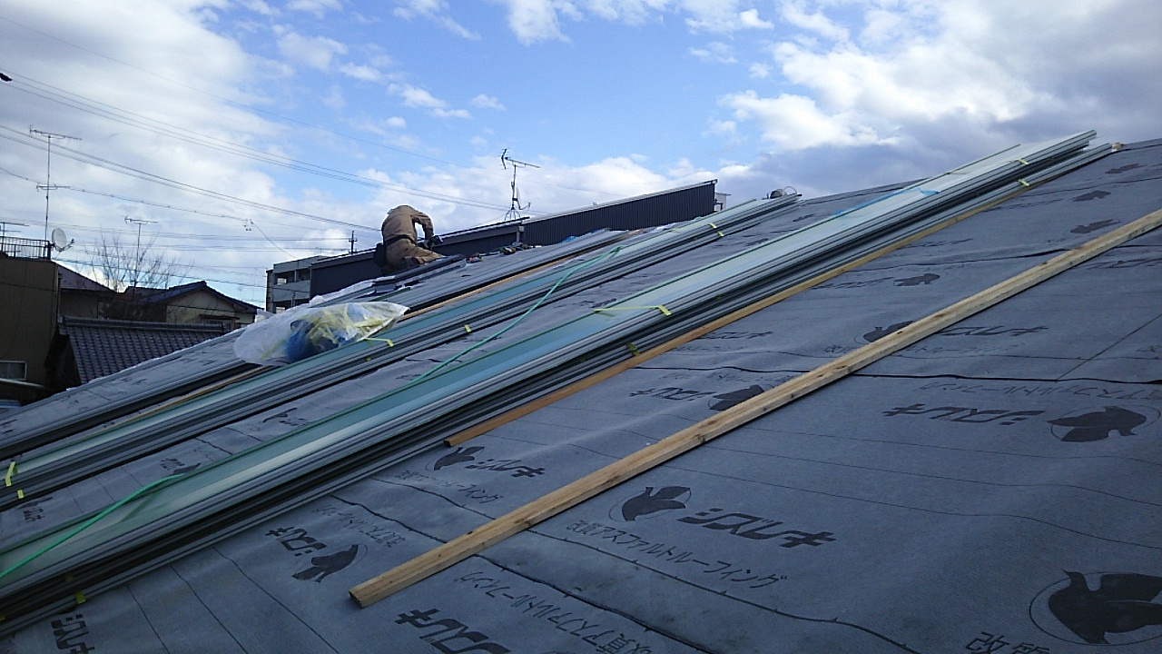 今回はガルバリウム鋼板角波板を採用しています。未施工部分の白い防水シートとのコントラストが街灯に照らされてくっきりと表れています。