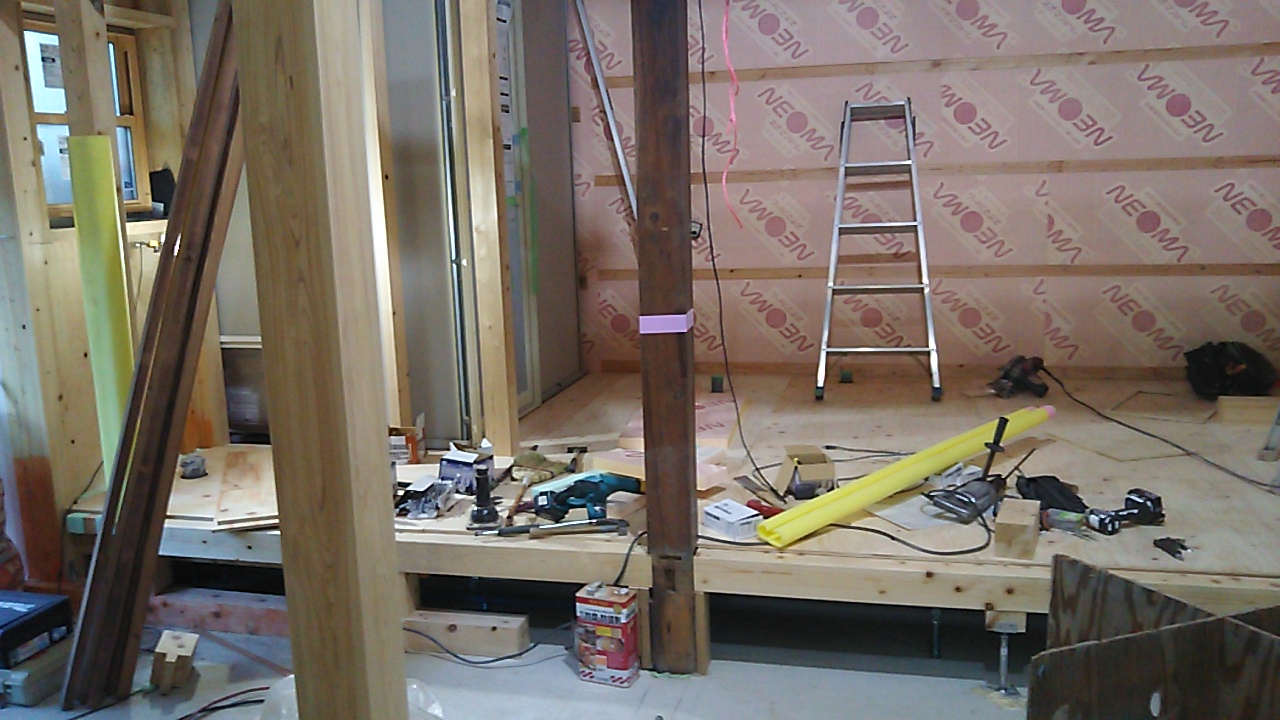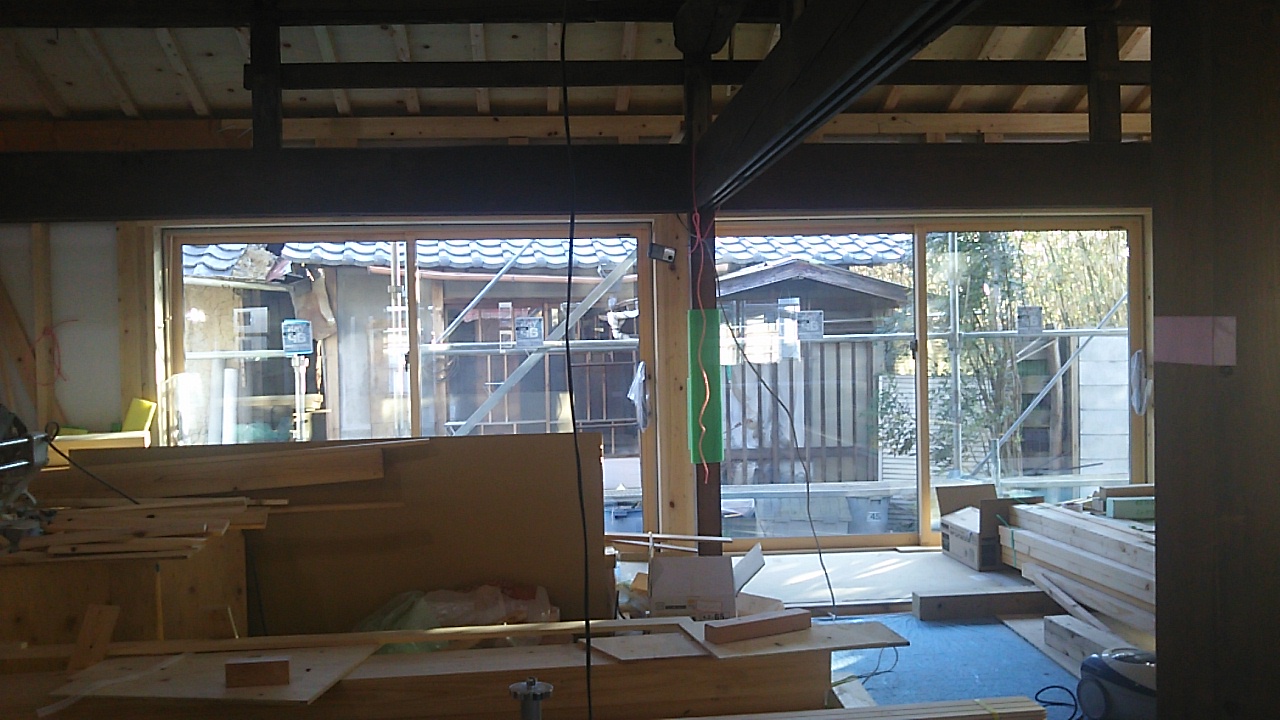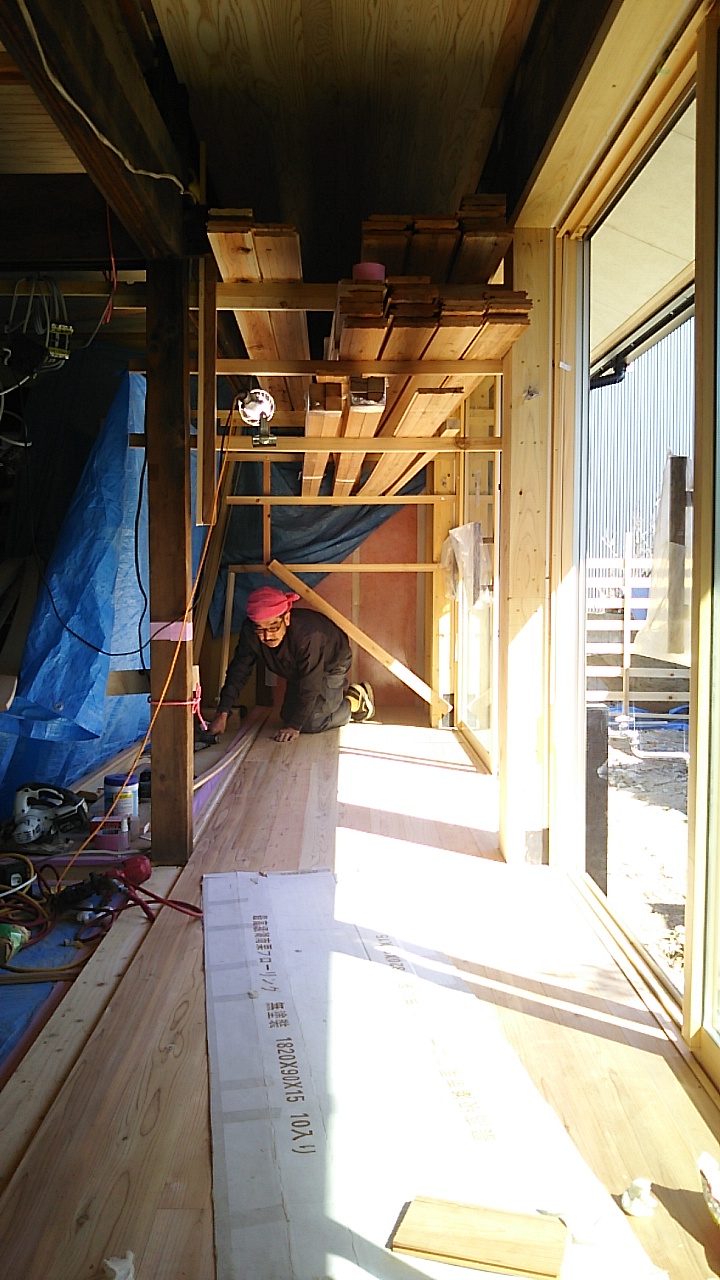 縁側の床板張工事。日差しが差すと暖かそうです。これから作業中には汗ばむ季節、冬にこれだけ日当たりが良いと十分です。