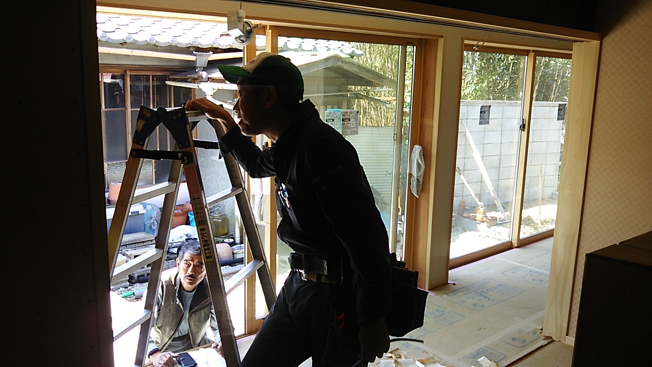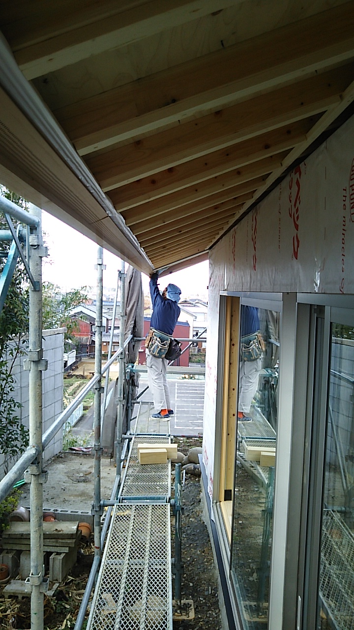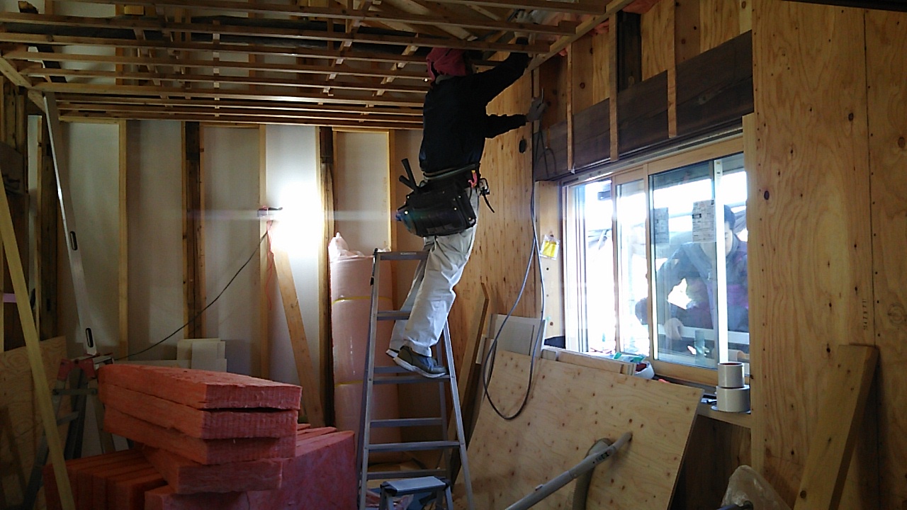 天井下地を取り付ける大工さん。そして窓の外には霊が・・・・? いやいや外部でサッシ業者さんが窓シャッターの取り付けを行っているのです。