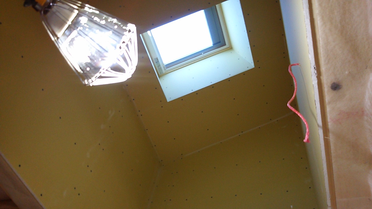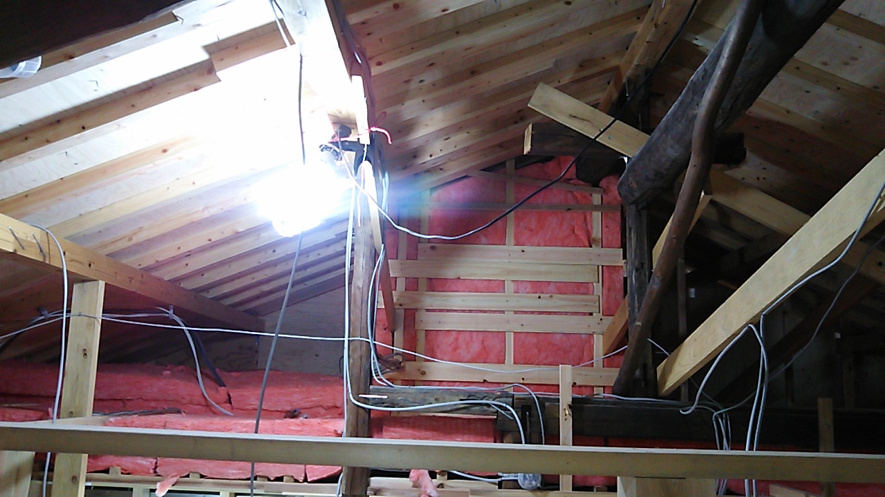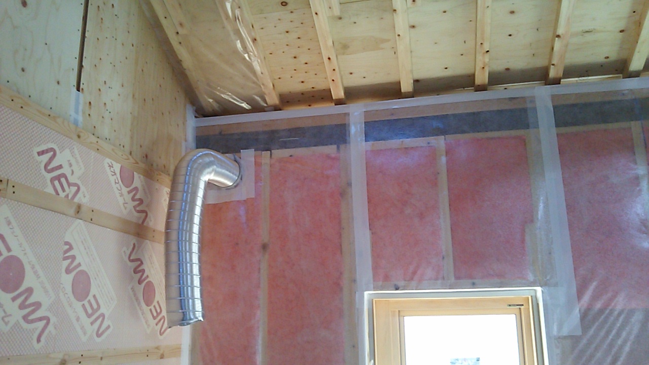 今回は天井面に断熱材を施しますので、屋根面へ上る壁の部分に上記写真のような断熱材の一角ができます。