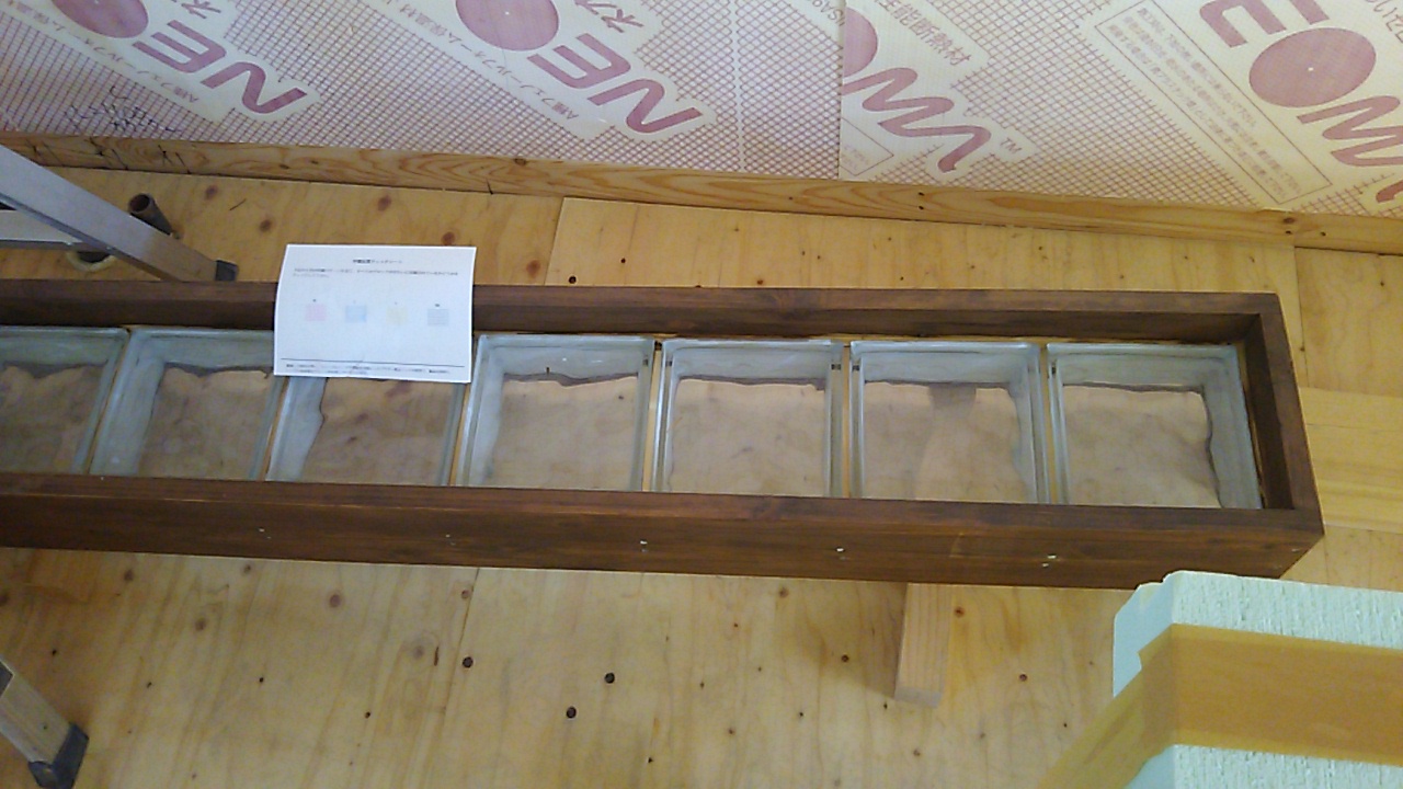 内装下地工事が一部できあがってきています。先日のガラスブロックが勝手口引戸の脇に設置されました。