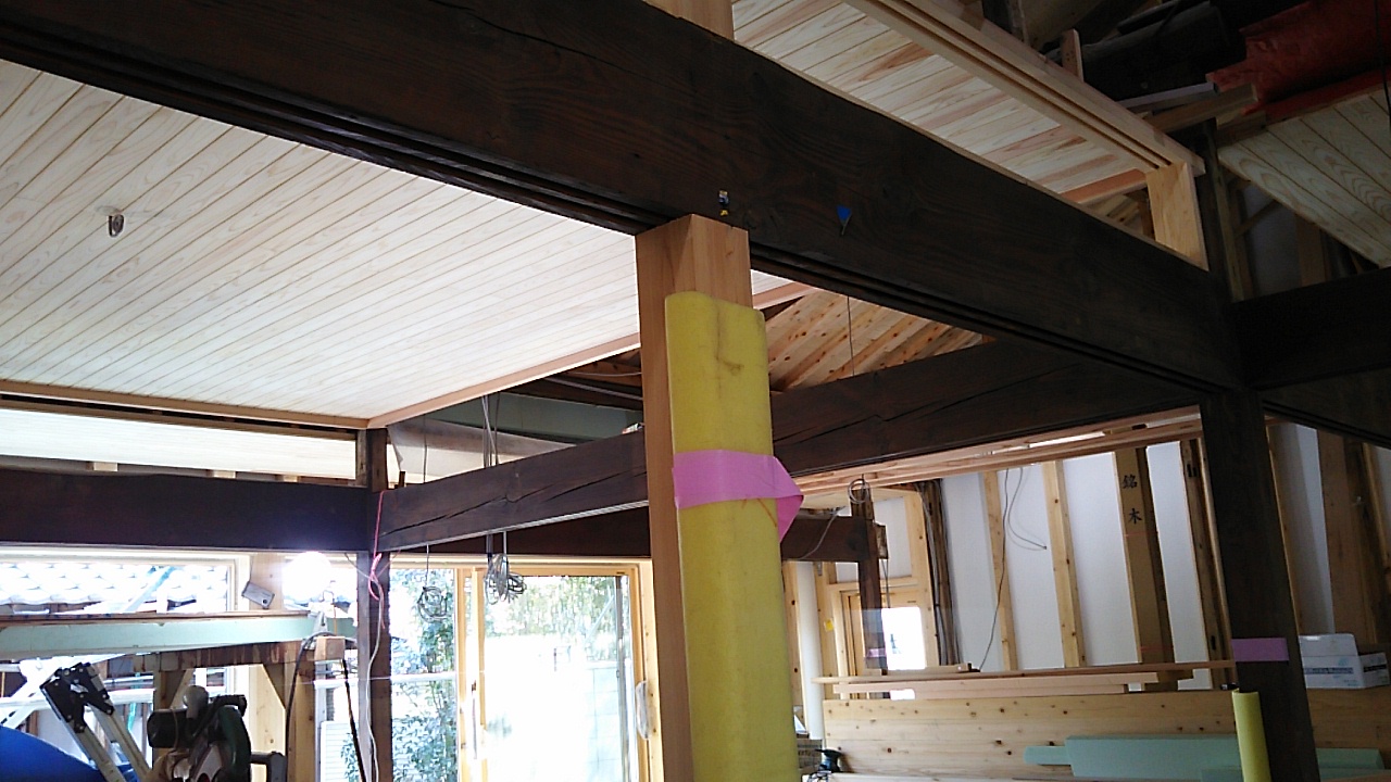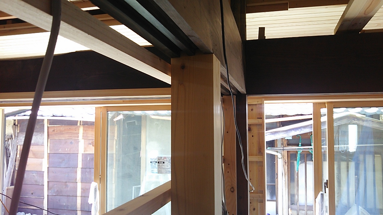 新旧色の違う構造材が一辺に見渡せますと、コントラストが綺麗に見えます。