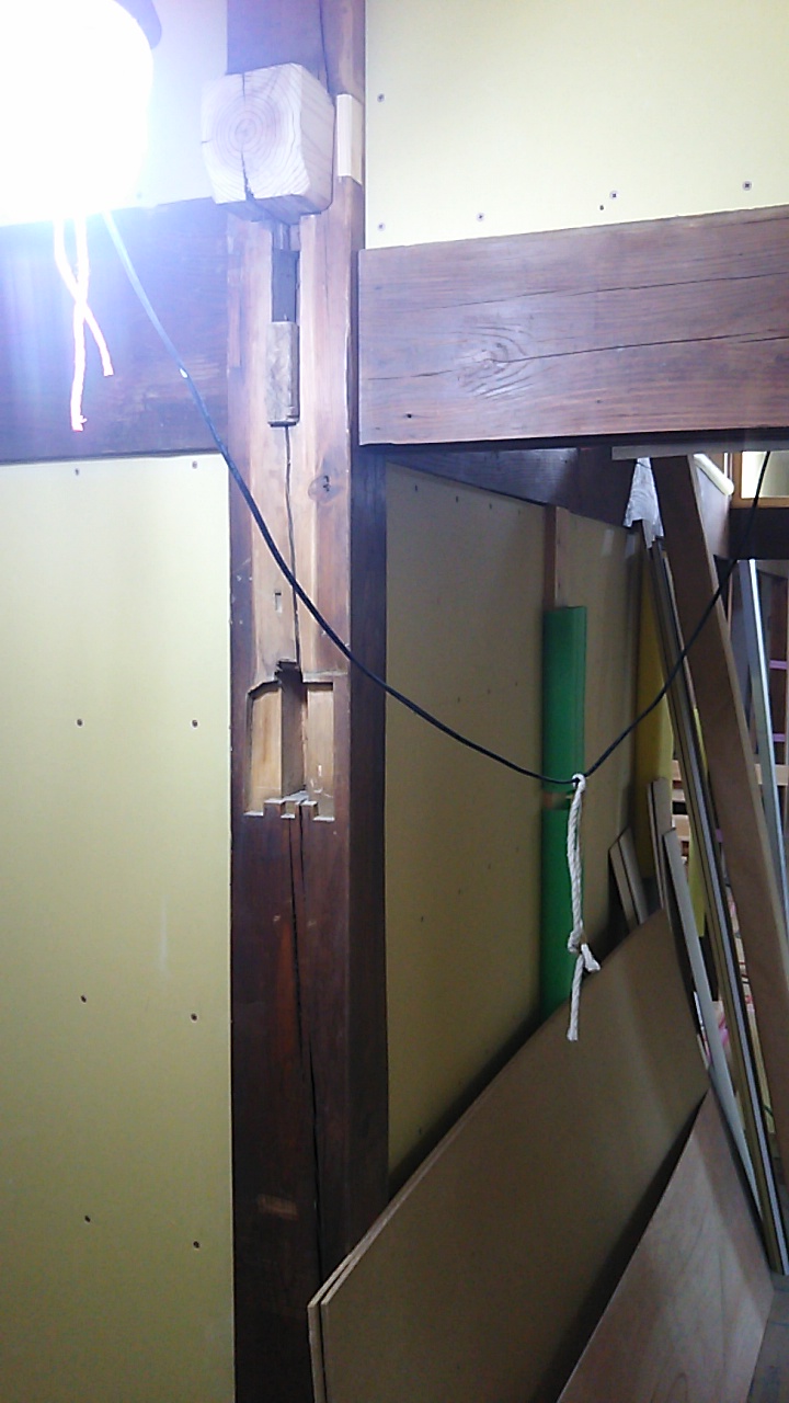 ※仕口(しくち):柱と梁、梁と梁などが直行方向に接続される部分に施される加工の事を指します。写真では柱の正面に古い鴨居が取り付けられていた跡が見て取れます。