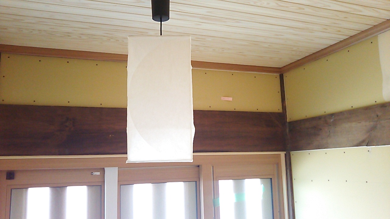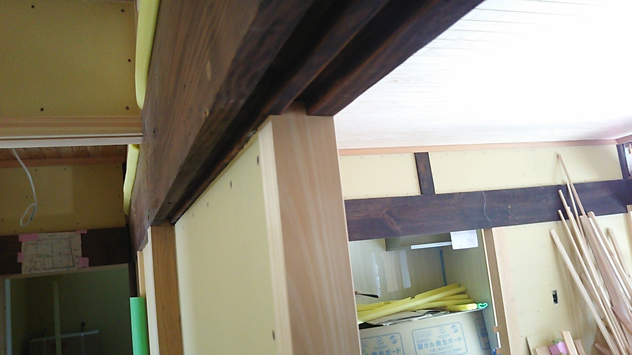 内部造作。古材の黒っぽい色と石膏ボード表面の黄色い紙とのコントラストがレトロな雰囲気を醸し出しています。