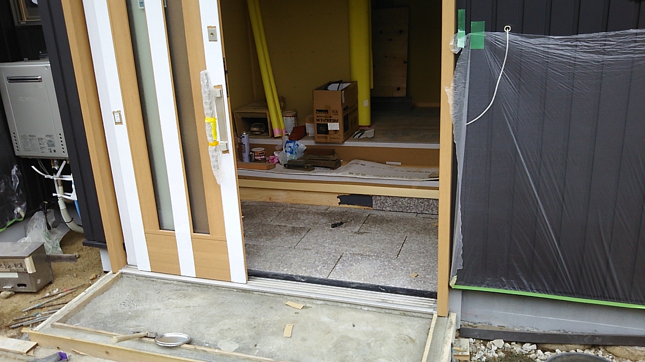 玄関には御影石が貼り込まれています。このあとポーチ部分も貼られる予定です。