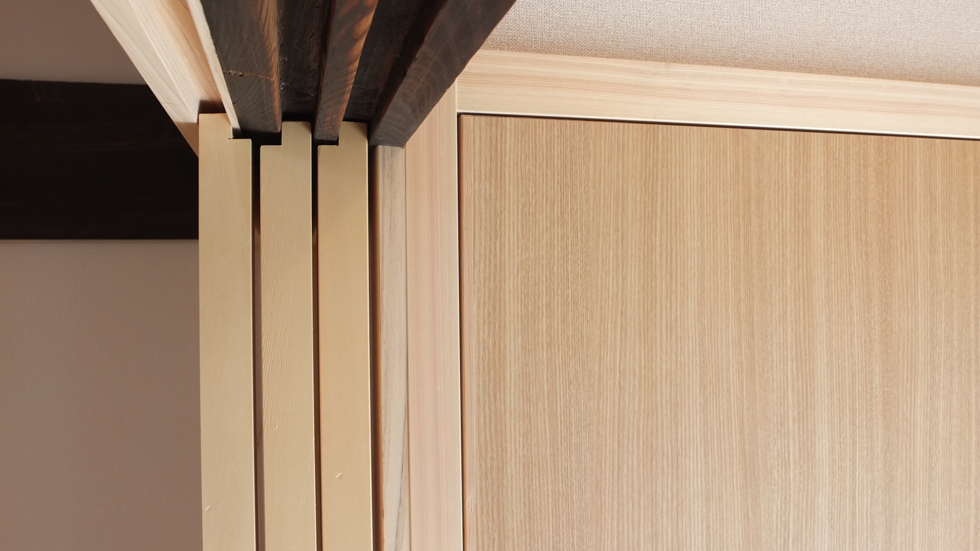 引違戸に使われていた差鴨居をそのまま残し、溝を一本追加することによって差鴨居を活かす造作をしてもらいました。