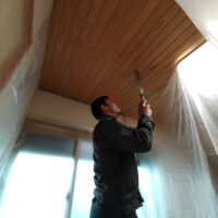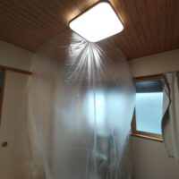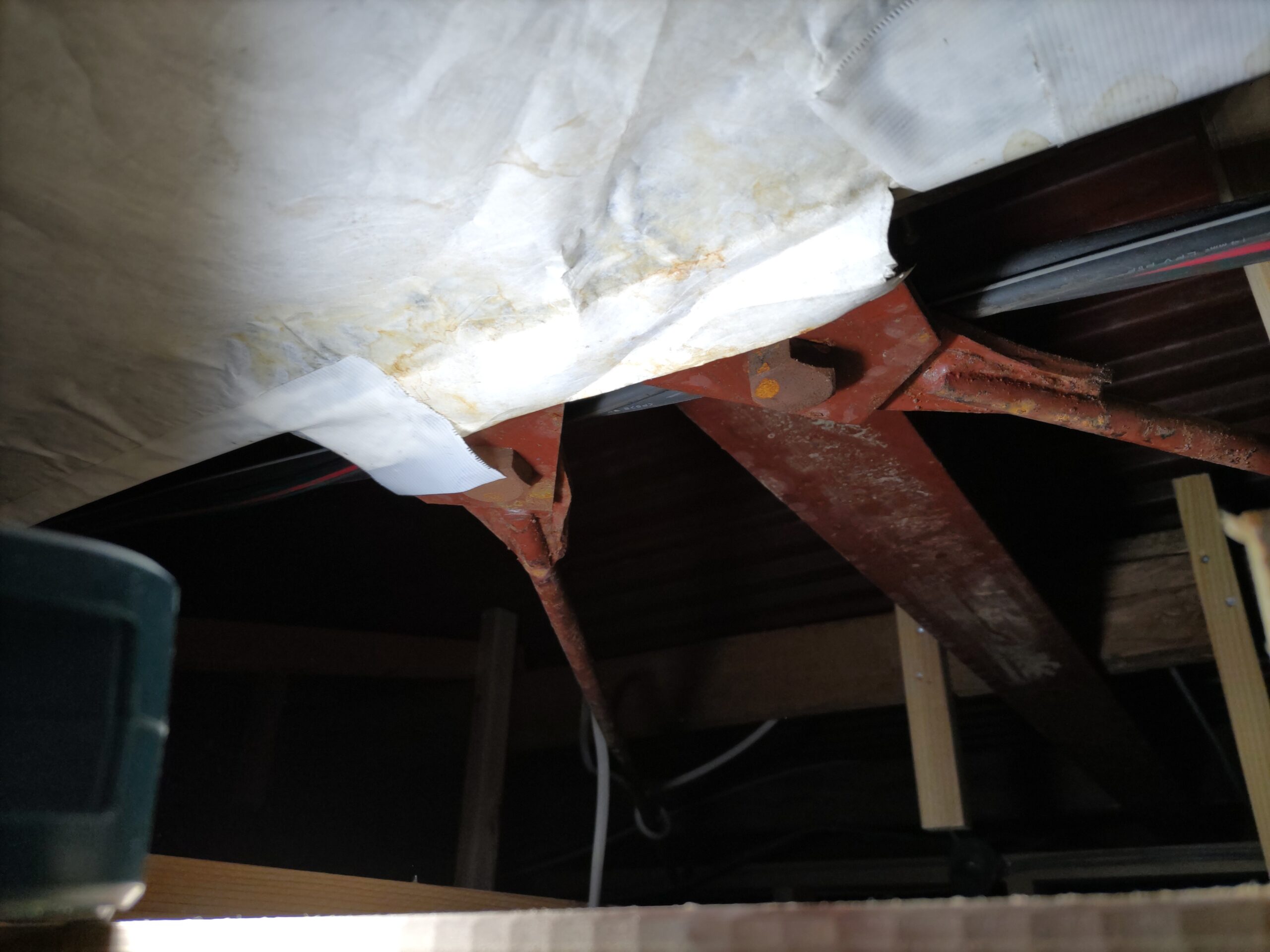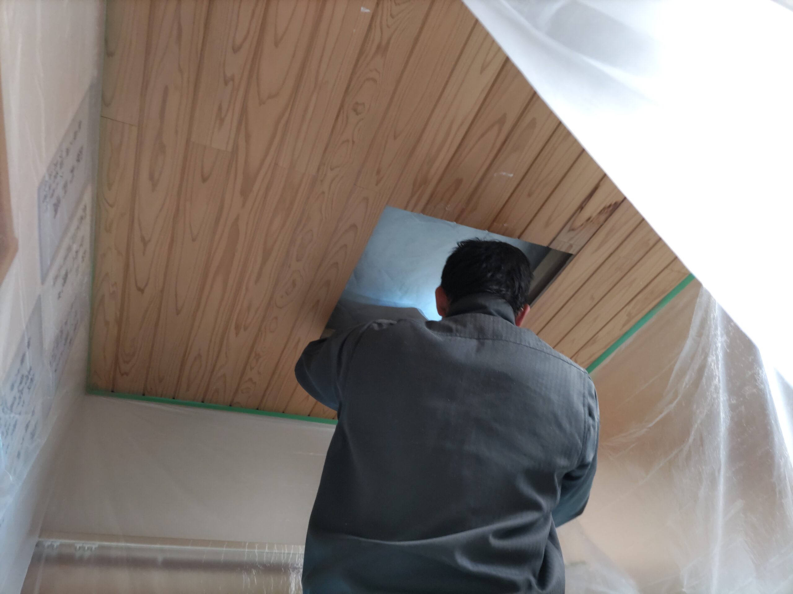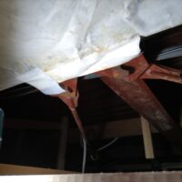 リフォームしたのも早や9年前。各箇所のメンテナンスに備え、まずは天井裏をチェックするために点検口を設ける事にしました。鉄骨造のビーム、ブレーシングに貼られたシートを見て当時の記憶がよみがえってきました。大雨が降っても上階のバルコニーから漏ってこないようにt口さんが張っていたような記憶があります。