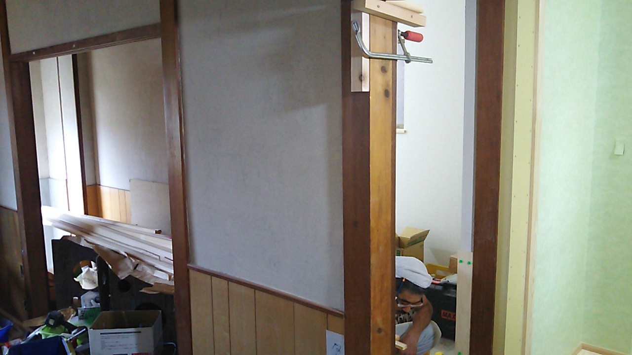 正面の出入口を解体して、新しく外壁を造るまでの仮の壁をつくっています。
