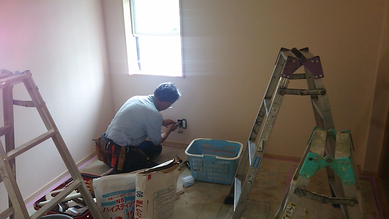 仕上工程。電気配線工事のコンセントやスイッチを取り付けています。