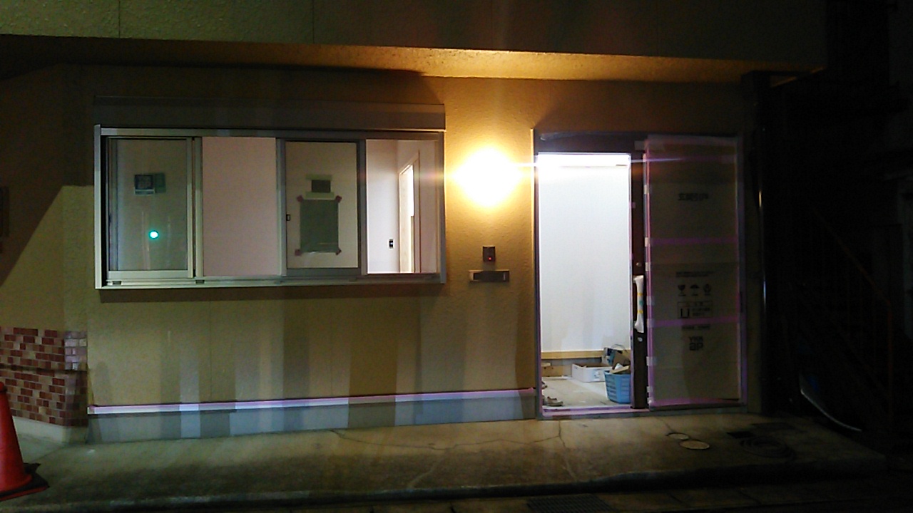 正面の出入口を撤去しました。新しいサッシを取り付ける外壁ができるまで内側に合板で仮囲いを取り付けています。