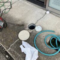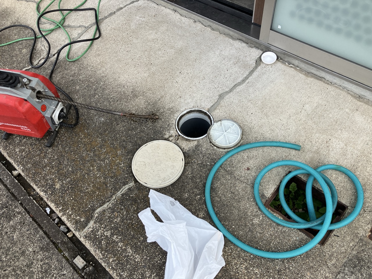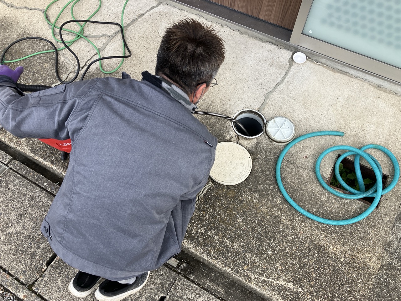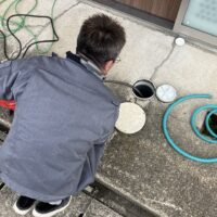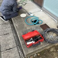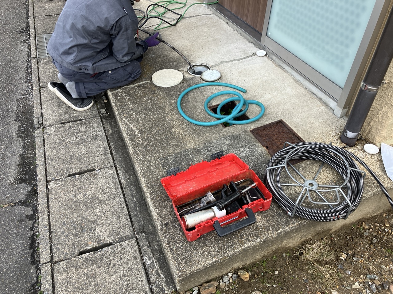 外部の桝から配管の詰まりチェック。先日トイレの水が流れにくくなった事から、配管内に引っかかりが無いかチェックすると共に、除去できるマシンを駆動するa野さん。ひとまずは配管内をキレイにする事ができています。