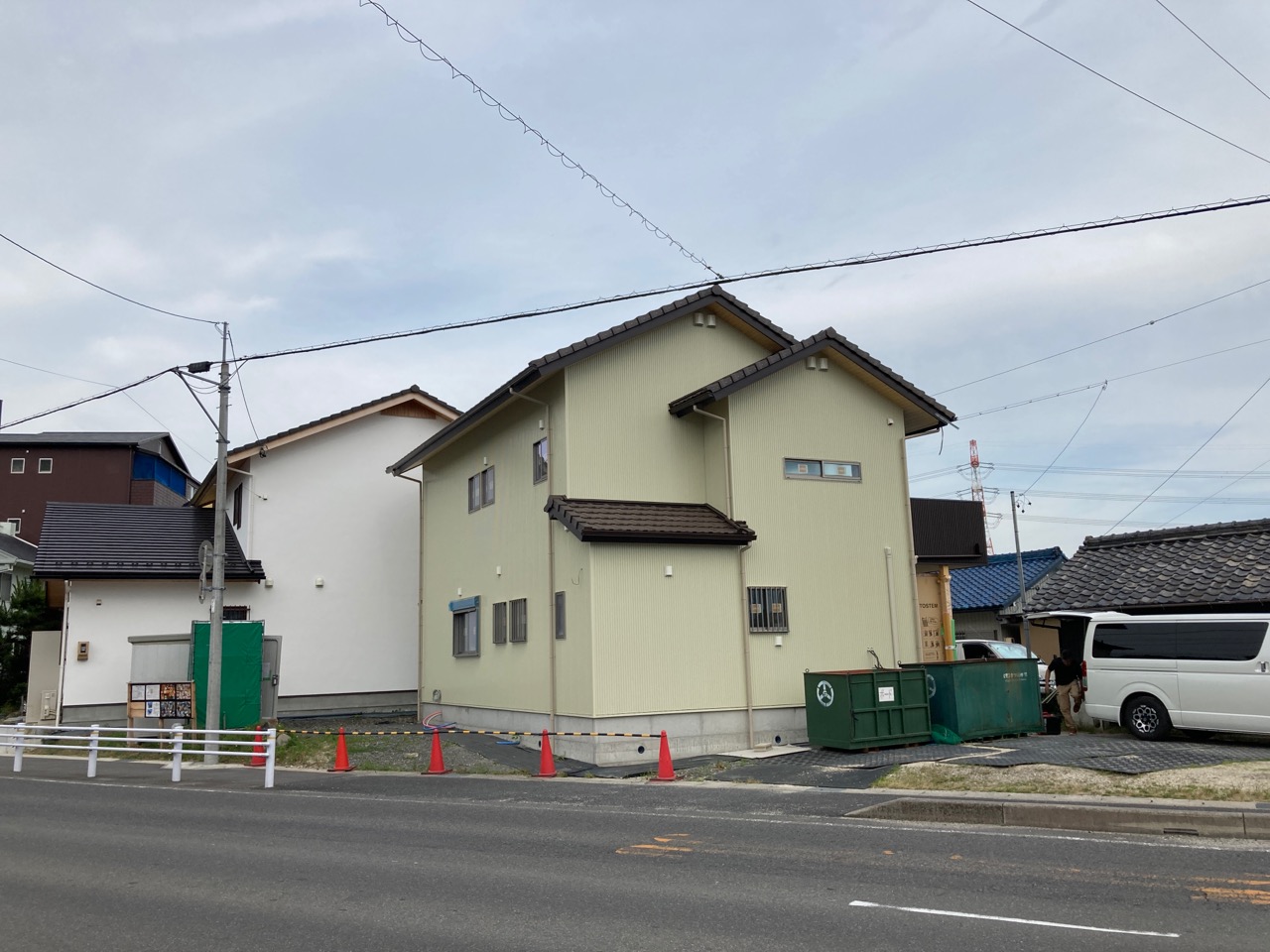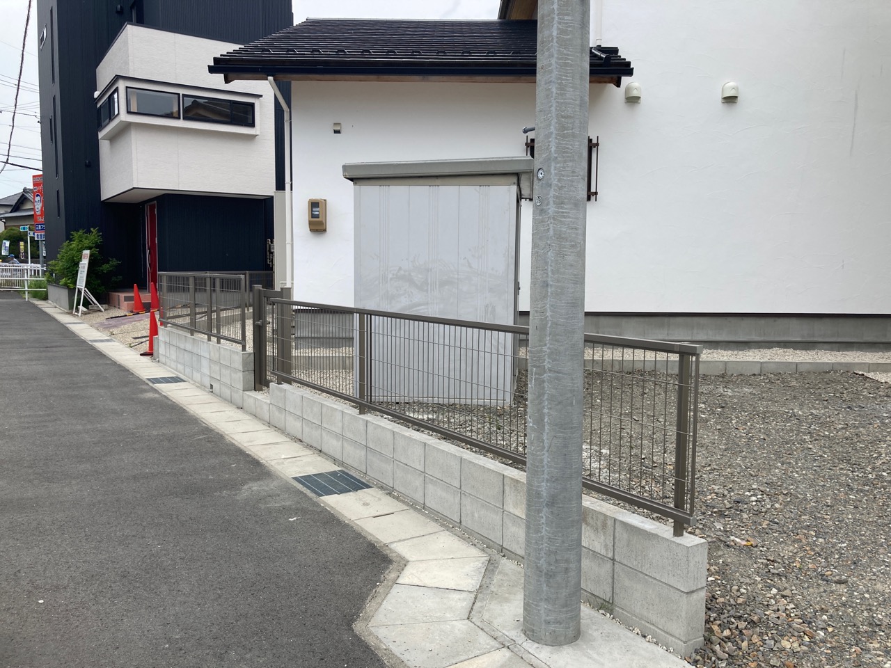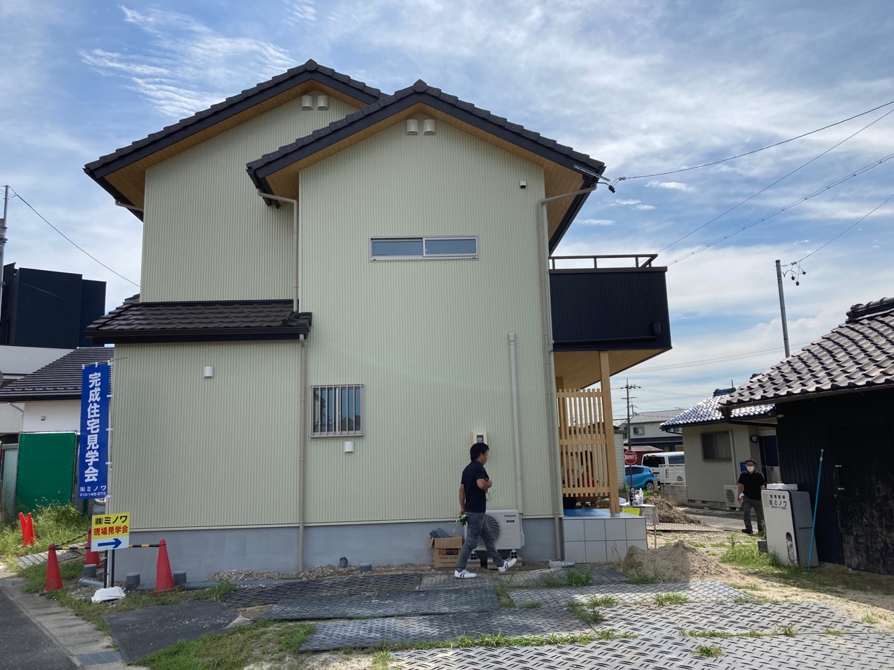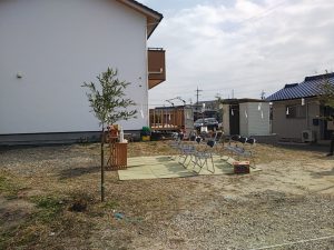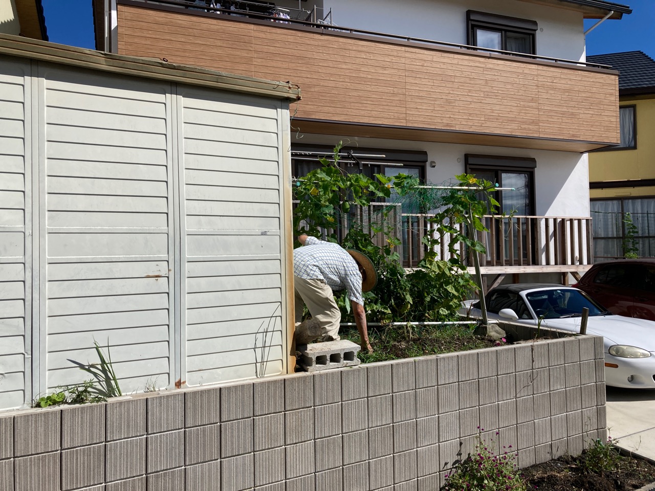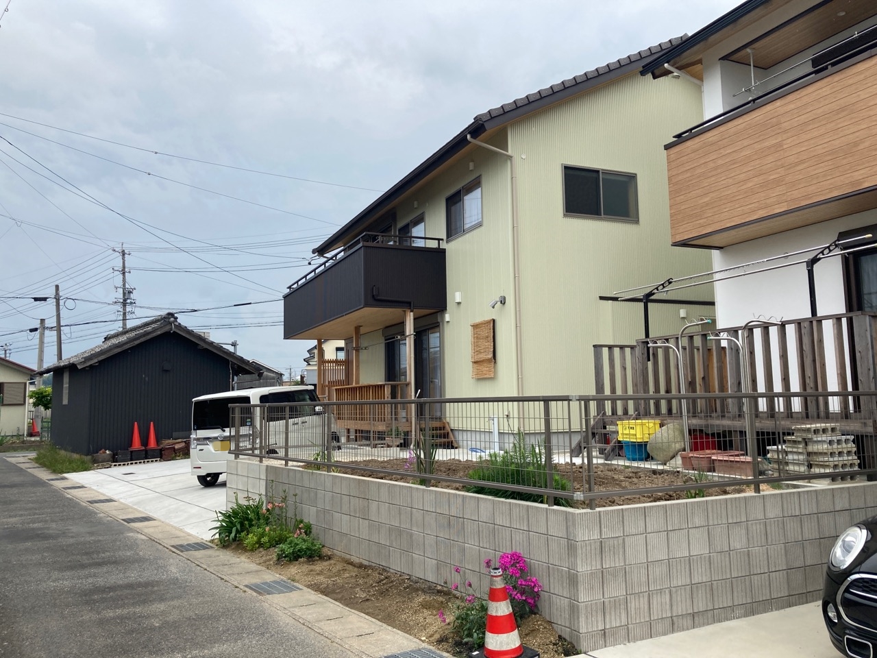 外構工事も終了したので外観の写真を撮影しつつ、残りの細かいお打ち合わせにやってきました。東隣のmi様は庭で家庭菜園の世話の真っ最中。こうして緑があると外観として絵になります。