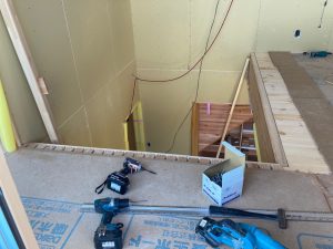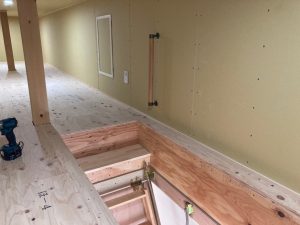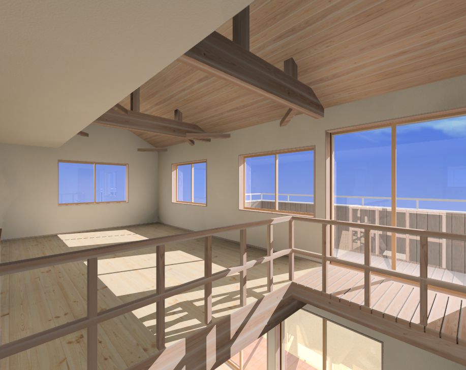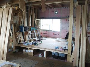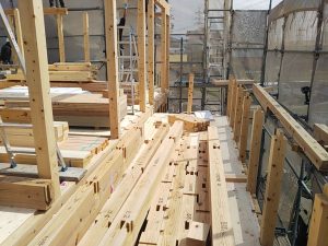 2階の架構が組みあがってきました。と同時にバルコニーも形作られています。バルコニーの床高さを2階の床面と合わせる、あるいは右写真のように一段下げるという2通りの手法が考えられますが、筆者は好んで下げる方法をとっています。防水工事の関係上、床面を揃えると部屋からバルコニーへ出る際に床から20㎝程の壁を乗り越えて外へ出る、という形になります。右写真のように床面を下げた場合は部屋からは床の段差はありませんが、バルコニー側へ降りる段差はある、という形。部屋内から見たスッキリ感の方を取ってこのように下げる形式としています。ただしこの場合はバルコニーを支える柱が1階部分に必要となります。